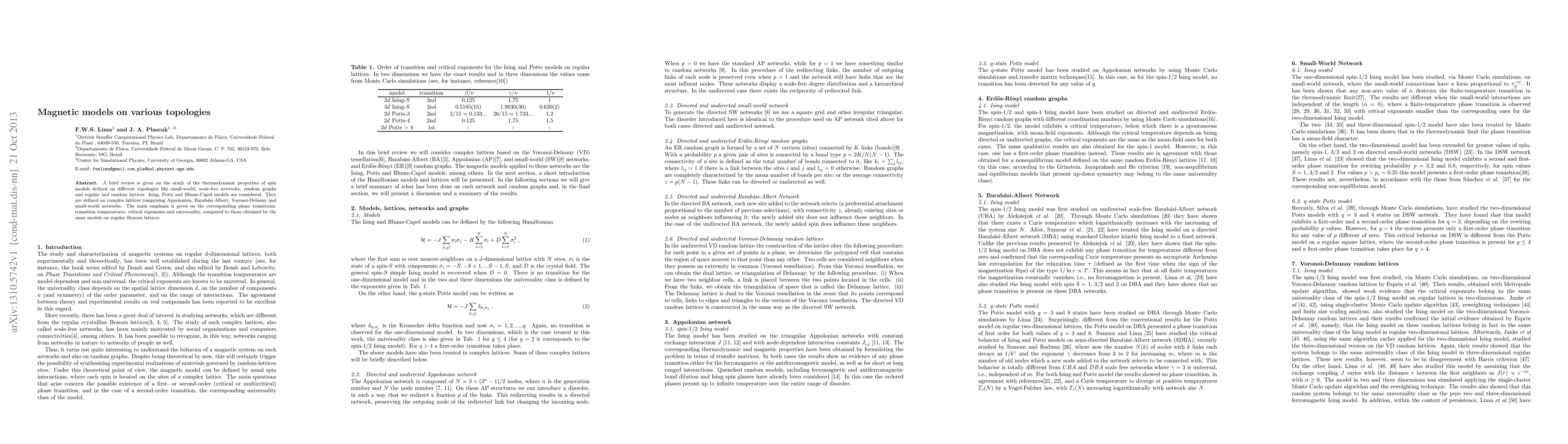 A brief review is given on the study of the thermodynamic properties of spin models defined on different topologies like small-world, scale-free networks, random graphs and regular and random lattices. Ising, Potts and Blume-Capel models are considered. They are defined on complex lattices comprising Appolonian, Barab\'asi-Albert, Voronoi-Delauny and small-world networks. The main emphasis is given on the corresponding phase transitions, transition temperatures, critical exponents and universality, compared to those obtained by the same models on regular Bravais lattices.