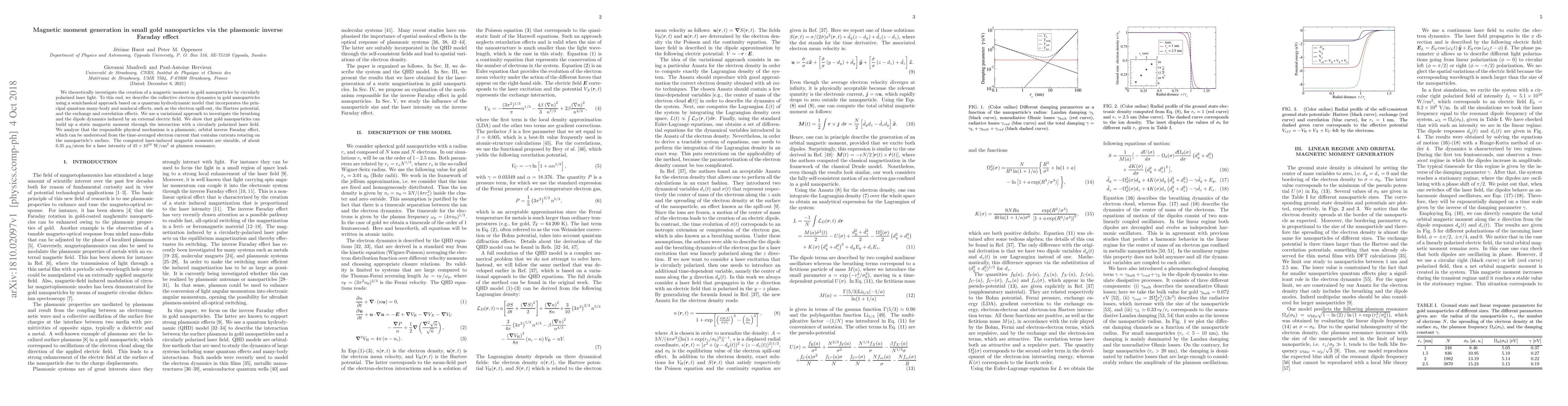 We theoretically investigate the creation of a magnetic moment in gold nanoparticles by circularly polarized laser light. To this end, we describe the collective electron dynamics in gold nanoparticles using a semiclassical approach based on a quantum hydrodynamic model that incorporates the prin- cipal quantum many-body and nonlocal effects, such as the electron spill-out, the Hartree potential, and the exchange and correlation effects. We use a variational approach to investigate the breathing and the dipole dynamics induced by an external electric field. We show that gold nanoparticles can build up a static magnetic moment through the interaction with a circularly polarized laser field. We analyze that the responsible physical mechanism is a plasmonic, orbital inverse Faraday effect, which can be understood from the time-averaged electron current that contains currents rotating on the nanoparticles surface. The computed laser-induced magnetic moments are sizeable, of about 0.35 muB/atom for a laser intensity of 450 GW/cm2 at plasmon resonance.