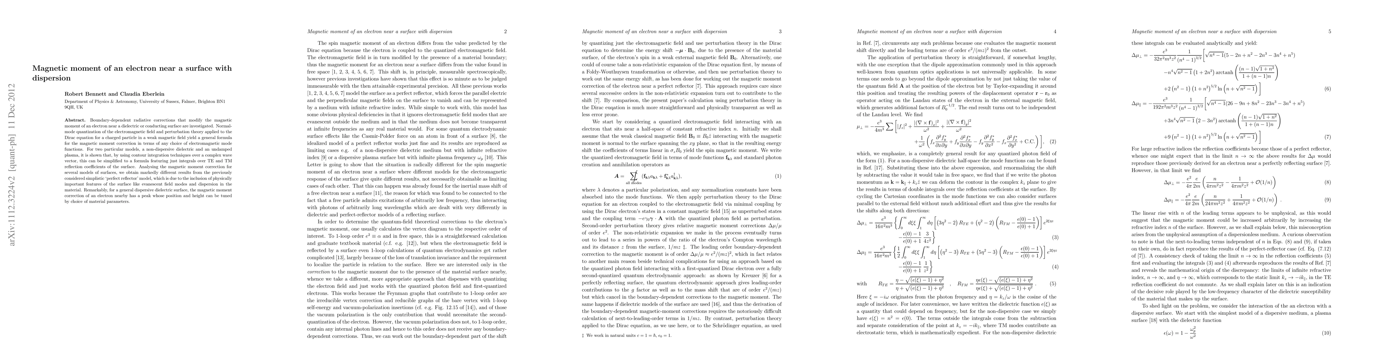 This paper investigates the boundary-dependent radiative corrections affecting the magnetic moment of an electron near a surface with dispersion, revealing significant differences from the `perfect reflector' model due to the inclusion of evanescent field modes and material dispersion. The study provides a general formula for the correction and shows that the magnetic moment's peak can be tuned by material parameters.