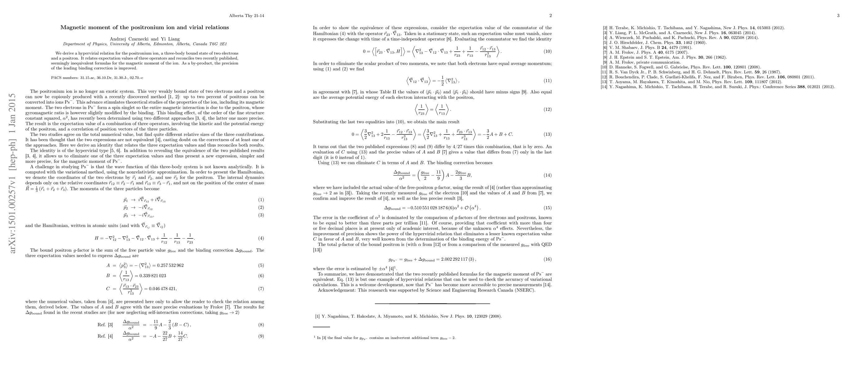 This paper derives a hypervirial relation for the positronium ion, linking expectation values of three operators and reconciling two formulas for its magnetic moment. It also enhances the precision of the leading binding correction.
