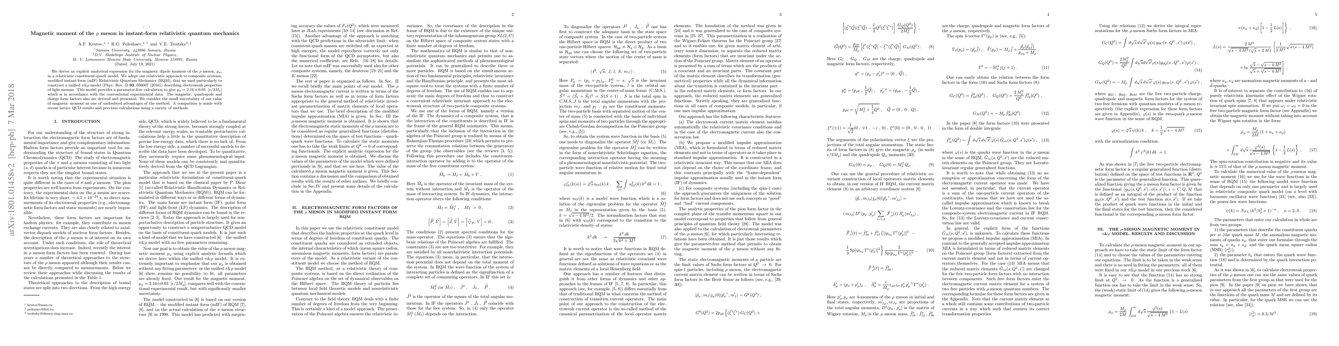 This paper derives an analytical expression for the magnetic dipole moment of the rho meson using a modified instant-form relativistic quantum mechanics approach, yielding a value of mu_rho=(2.16±0.03) [e/2M_rho], which aligns with experimental data and shows small uncertainty. The study also presents magnetic, quadrupole, and charge form factors and compares results to lattice QCD and previous methods.
