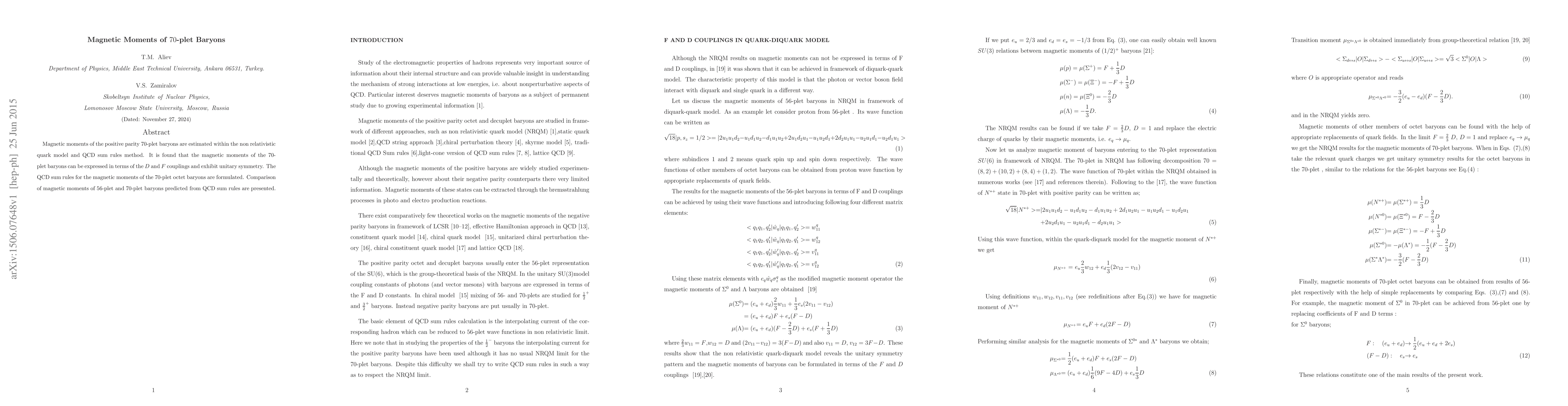 This paper estimates the magnetic moments of the positive parity 70-plet baryons using the non-relativistic quark model and QCD sum rules, revealing their expression in terms of D and F couplings and unitary symmetry. It also formulates QCD sum rules for the 70-plet octet baryons and compares their magnetic moments with those of the 56-plet baryons.