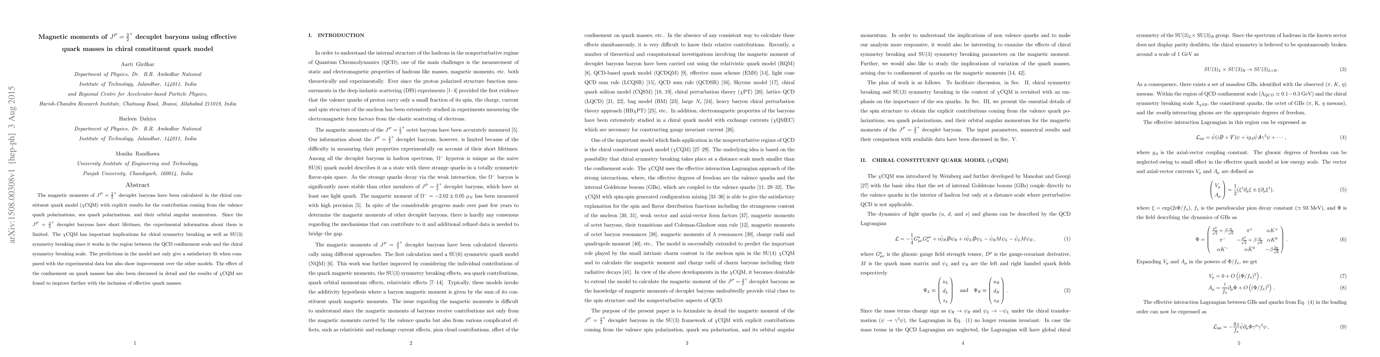 This paper calculates the magnetic moments of $J^P=\frac{3}{2}^+$ decuplet baryons using the chiral constituent quark model ($\chi$CQM), detailing contributions from quark polarizations and orbital angular momentum. The model shows improved predictions over other models and highlights the implications of chiral symmetry breaking.