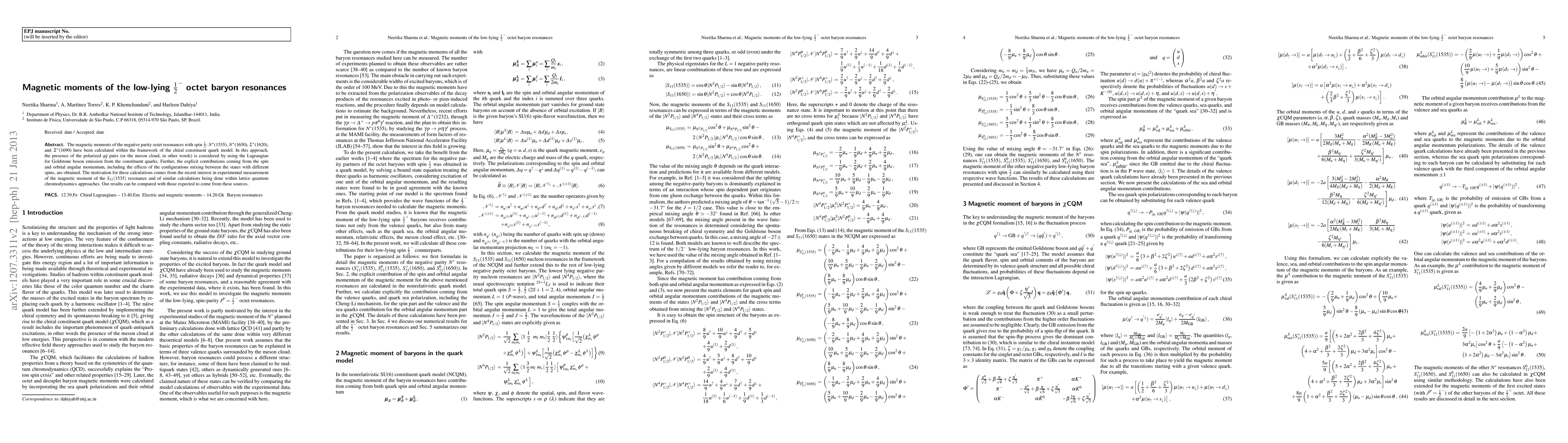 The magnetic moments of the negative parity octet resonances with spin {1/2}: $N^*$(1535), $N^*$(1650), $\Sigma^*$(1620), and $\Xi^*$(1690) have been calculated within the framework of the chiral constituent quark model. In this approach, the presence of the polarized $q\bar{q}$ pairs (or the meson cloud, in other words) is considered by using the Lagrangian for Goldstone boson emission from the constituent quarks. Further, the explicit contributions coming from the spin and orbital angular momentum, including the effects of the configurations mixing between the states with different spins, are obtained. The motivation for these calculations comes from the recent interest in experimental measurement of the magnetic moment of the ${S_{11}(1535)}$ resonance and of similar calculations being done within lattice quantum chromodynamics approaches. Our results can be compared with those expected to come from these sources.