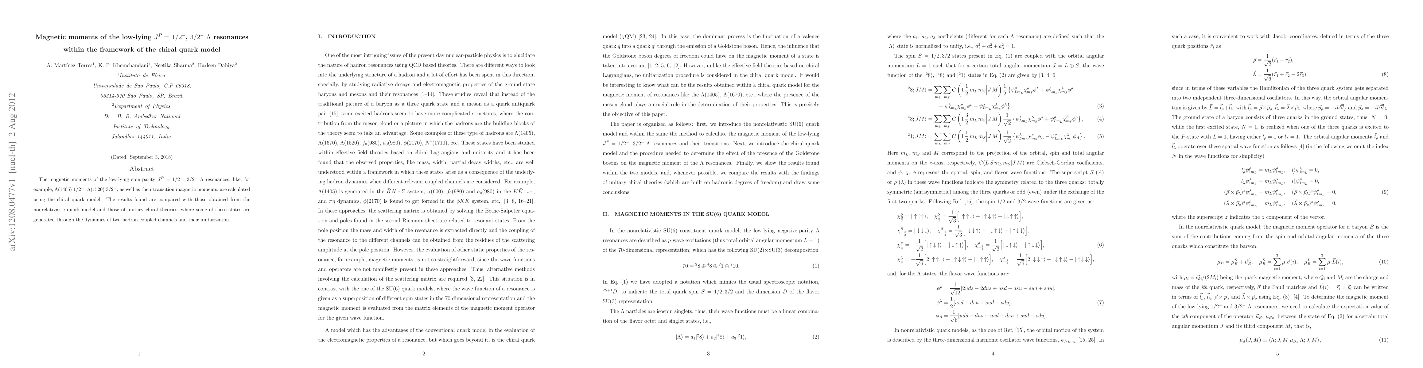 The magnetic moments of the low-lying spin-parity $J^P=$ $1/2^-$, $3/2^-$ $\Lambda$ resonances, like, for example, $\Lambda(1405)$ $1/2^-$, $\Lambda(1520)$ $3/2^-$, as well as their transition magnetic moments, are calculated using the chiral quark model. The results found are compared with those obtained from the nonrelativistic quark model and those of unitary chiral theories, where some of these states are generated through the dynamics of two hadron coupled channels and their unitarization.