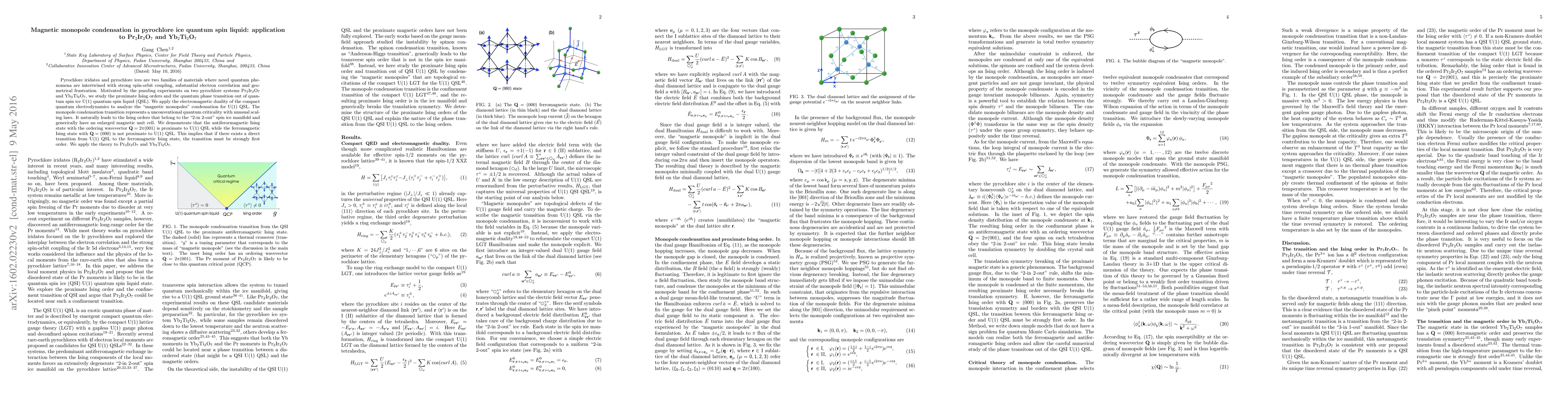 This paper investigates the magnetic monopole condensation in pyrochlore quantum spin liquids, focusing on the quantum phase transition from U(1) QSL to Ising orders in Pr2Ir2O7 and Yb2Ti2O7. The study reveals that the antiferromagnetic Ising state is proximate to the U(1) QSL, while the ferromagnetic Ising state is not, suggesting a strongly first-order transition if it exists.