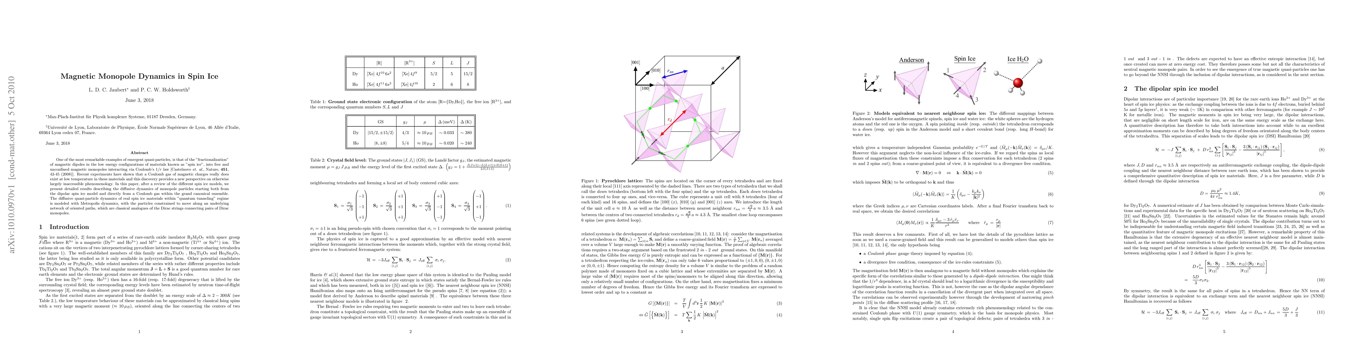 This paper investigates the emergent quasi-particles in spin ice materials, specifically the dynamics of magnetic monopoles, which behave as free charges interacting via Coulomb's law. The study models the diffusive dynamics of these monopoles using Metropolis dynamics, constrained to move along classical analogues of Dirac strings.