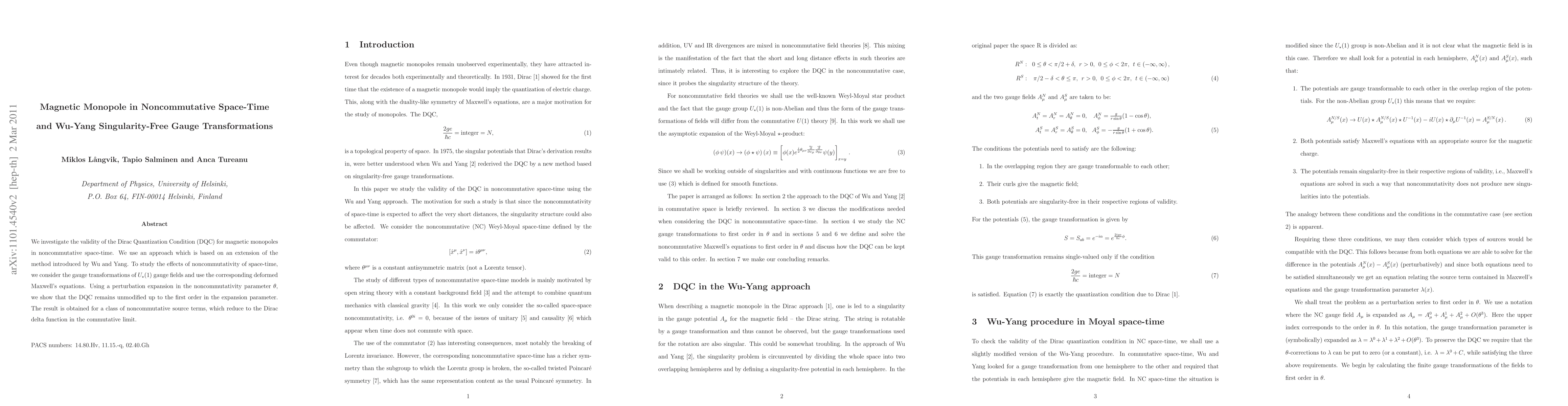 This paper examines the Dirac Quantization Condition for magnetic monopoles in noncommutative space-time, employing Wu-Yang gauge transformations and deformed Maxwell's equations. It finds that the DQC remains unchanged up to first order in the noncommutativity parameter, under a class of noncommutative source terms.