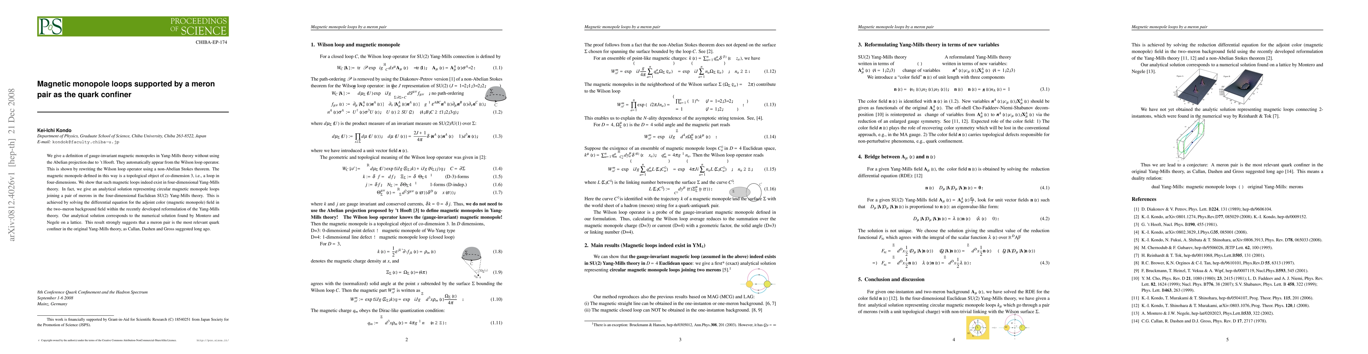 We give a definition of gauge-invariant magnetic monopoles in Yang-Mills theory without using the Abelian projection due to 't Hooft. They automatically appear from the Wilson loop operator. This is shown by rewriting the Wilson loop operator using a non-Abelian Stokes theorem. The magnetic monopole defined in this way is a topological object of co-dimension 3, i.e., a loop in four-dimensions. We show that such magnetic loops indeed exist in four-dimensional Yang-Mills theory. In fact, we give an analytical solution representing circular magnetic monopole loops joining a pair of merons in the four-dimensional Euclidean SU(2) Yang-Mills theory. This is achieved by solving the differential equation for the adjoint color (magnetic monopole) field in the two--meron background field within the recently developed reformulation of the Yang-Mills theory. Our analytical solution corresponds to the numerical solution found by Montero and Negele on a lattice. This result strongly suggests that a meron pair is the most relevant quark confiner in the original Yang-Mills theory, as Callan, Dashen and Gross suggested long ago.