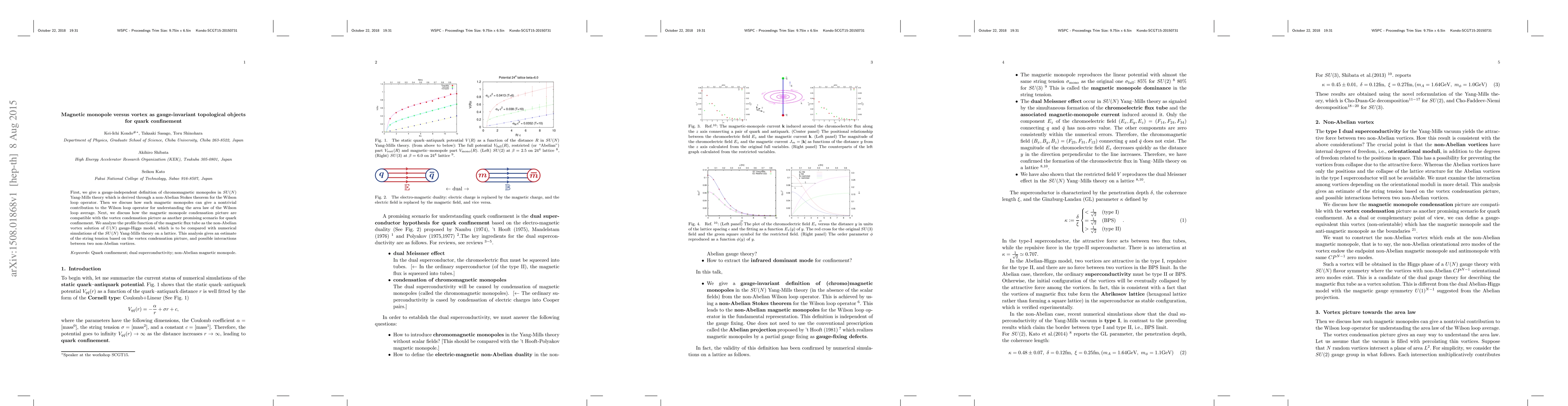 First, we give a gauge-independent definition of chromomagnetic monopoles in $SU(N)$ Yang-Mills theory which is derived through a non-Abelian Stokes theorem for the Wilson loop operator. Then we discuss how such magnetic monopoles can give a nontrivial contribution to the Wilson loop operator for understanding the area law of the Wilson loop average. Next, we discuss how the magnetic monopole condensation picture are compatible with the vortex condensation picture as another promising scenario for quark confinement. We analyze the profile function of the magnetic flux tube as the non-Abelian vortex solution of $U(N)$ gauge-Higgs model, which is to be compared with numerical simulations of the $SU(N)$ Yang-Mills theory on a lattice. This analysis gives an estimate of the string tension based on the vortex condensation picture, and possible interactions between two non-Abelian vortices.