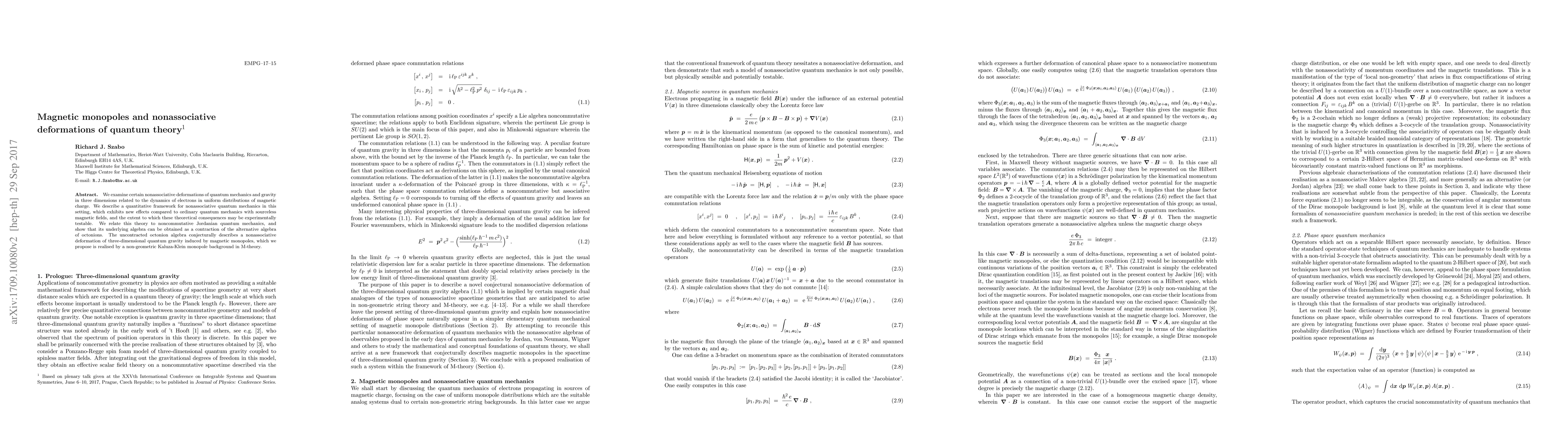 The paper examines nonassociative deformations of quantum mechanics and gravity in three dimensions, relating them to electron dynamics in magnetic charge distributions. It introduces a quantitative framework for nonassociative quantum mechanics, demonstrating new effects compared to ordinary quantum mechanics.