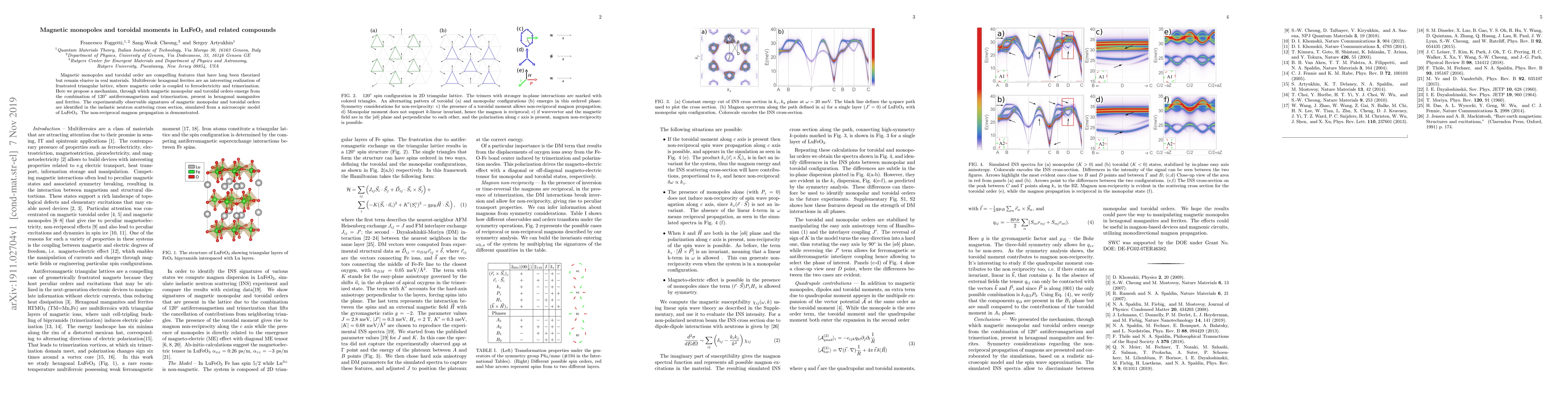 Magnetic monopoles and toroidal order are compelling features that have long been theorized but remain elusive in real materials. Multiferroic hexagonal ferrites are an interesting realization of frustrated triangular lattice, where magnetic order is coupled to ferroelectricity and trimerization. Here we propose a mechanism, through which magnetic monopolar and toroidal orders emerge from the combination of 120$^\circ$ antiferromagnetism and trimerization, present in hexagonal manganites and ferrites. The experimentally observable signatures of magnetic monopolar and toroidal orders are identified in the inelastic neutron scattering cross section, simulated from a microscopic model of LuFeO3. The non-reciprocal magnon propagation is demonstrated.