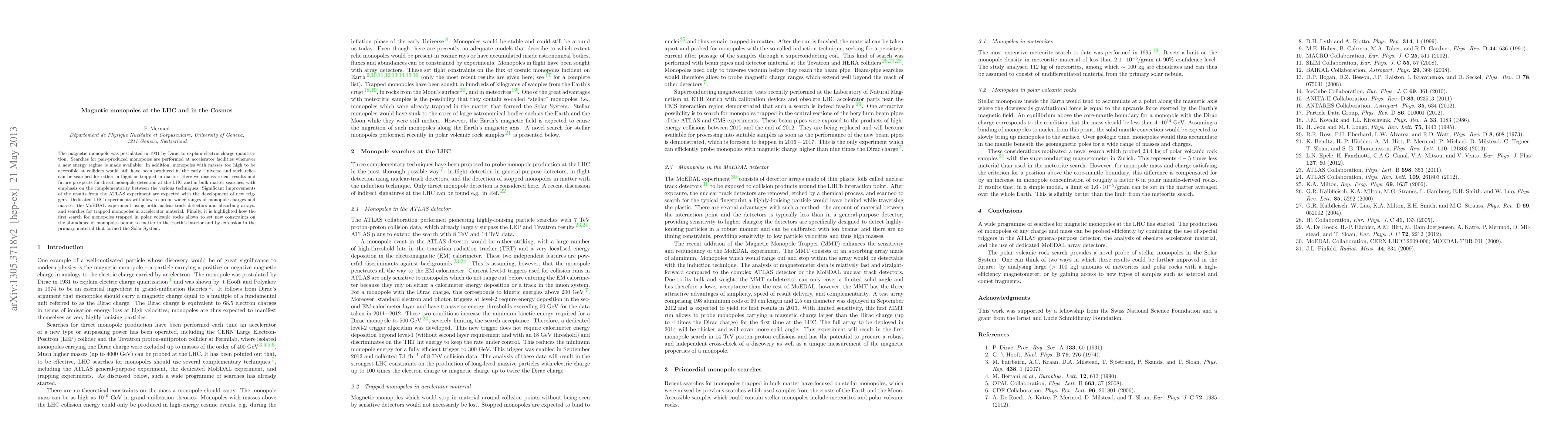 This paper discusses the search for magnetic monopoles at the LHC and in cosmic relics, emphasizing recent results and future prospects. It highlights improvements in the ATLAS experiment and the MoEDAL experiment's role in detecting monopoles, while also setting new constraints on monopole abundance in Earth's interior and the Solar System.