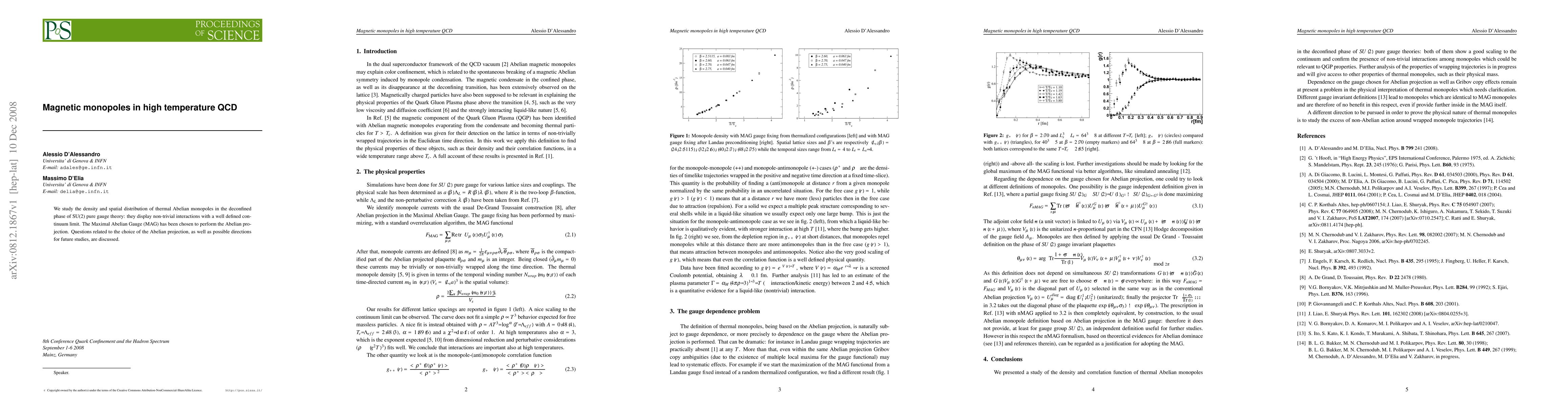 We study the density and spatial distribution of thermal Abelian monopoles in the deconfined phase of SU(2) pure gauge theory: they display non-trivial interactions with a well defined continuum limit. The Maximal Abelian Gauge (MAG) has been chosen to perform the Abelian projection. Questions related to the choice of the Abelian projection, as well as possible directions for future studies, are discussed.