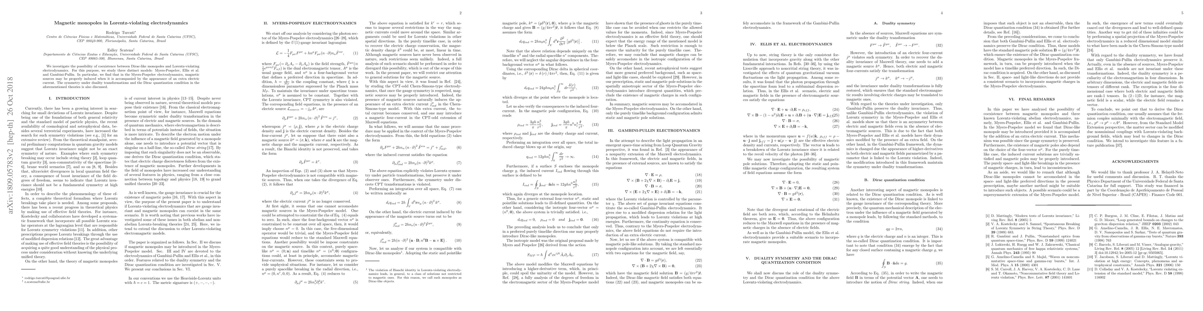 This paper explores the coexistence of Dirac-like monopoles within three distinct Lorentz-violating electrodynamics models: Myers-Pospelov, Ellis et al., and Gambini-Pullin. It finds that in Myers-Pospelov electrodynamics, magnetic monopoles can emerge alongside an extra electric current, while discussing symmetry and quantization conditions.