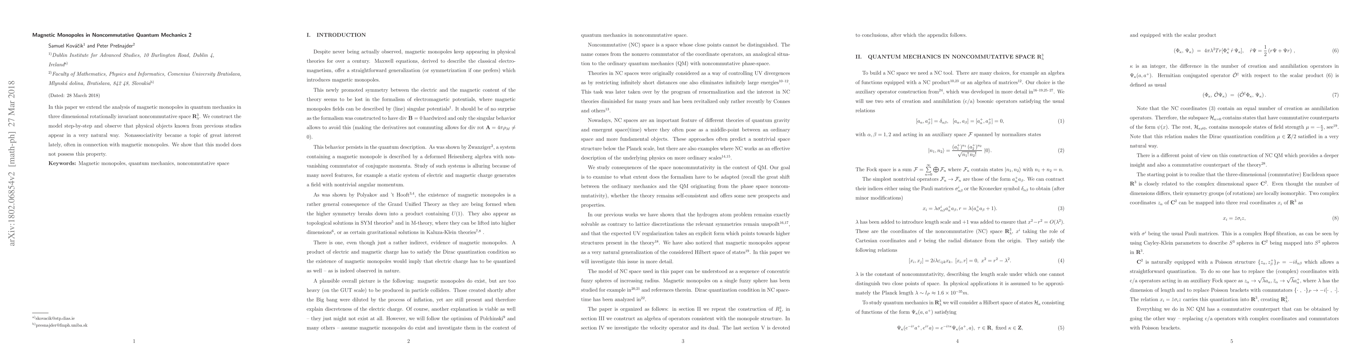 This paper develops a three-dimensional rotationally invariant model of magnetic monopoles in noncommutative quantum mechanics, observing the emergence of familiar physical objects and demonstrating that the model lacks nonassociativity.