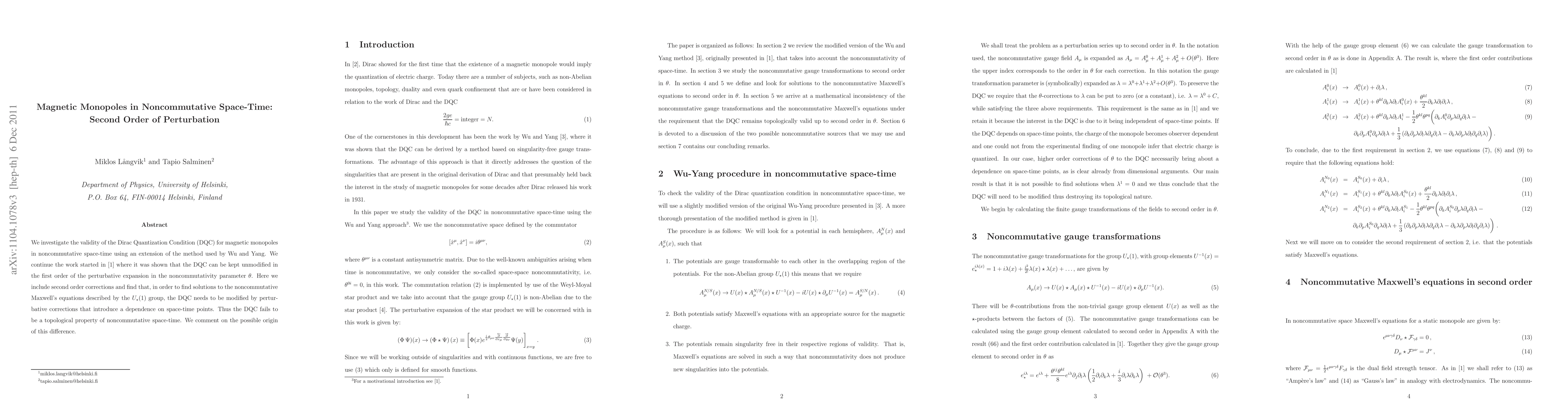 This research extends the study of magnetic monopoles in noncommutative space-time to second-order perturbation, revealing that the Dirac Quantization Condition (DQC) must be modified by perturbative corrections that depend on space-time points, thereby losing its topological nature. The findings suggest a new perspective on the effects of noncommutativity on Maxwell's equations.
