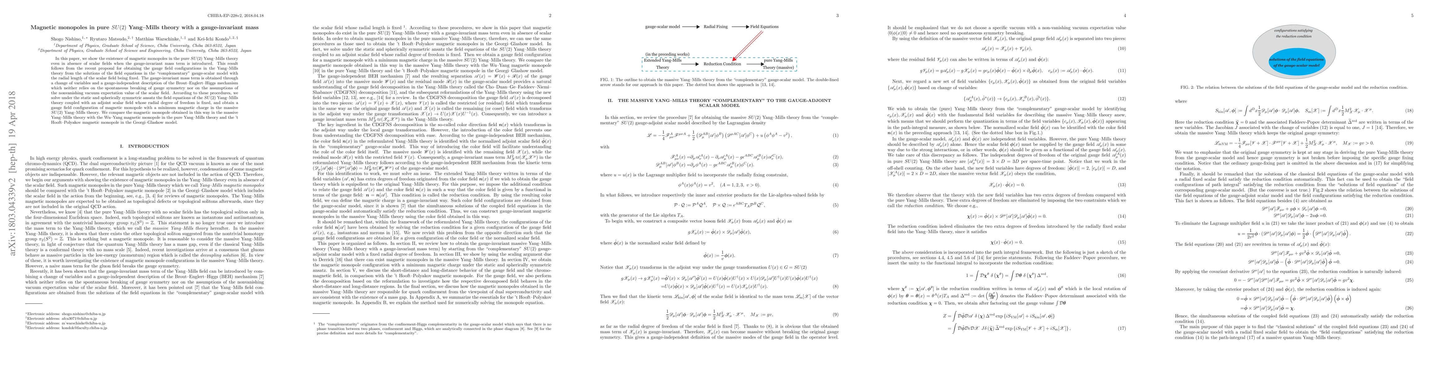 This paper demonstrates the existence of magnetic monopoles in pure $SU(2)$ Yang-Mills theory via a gauge-invariant mass term, achieved without scalar fields, using a modified gauge-independent Brout-Englert-Higgs mechanism. The monopole's configuration is compared with monopoles from the Wu-Yang and 't Hooft-Polyakov models.
