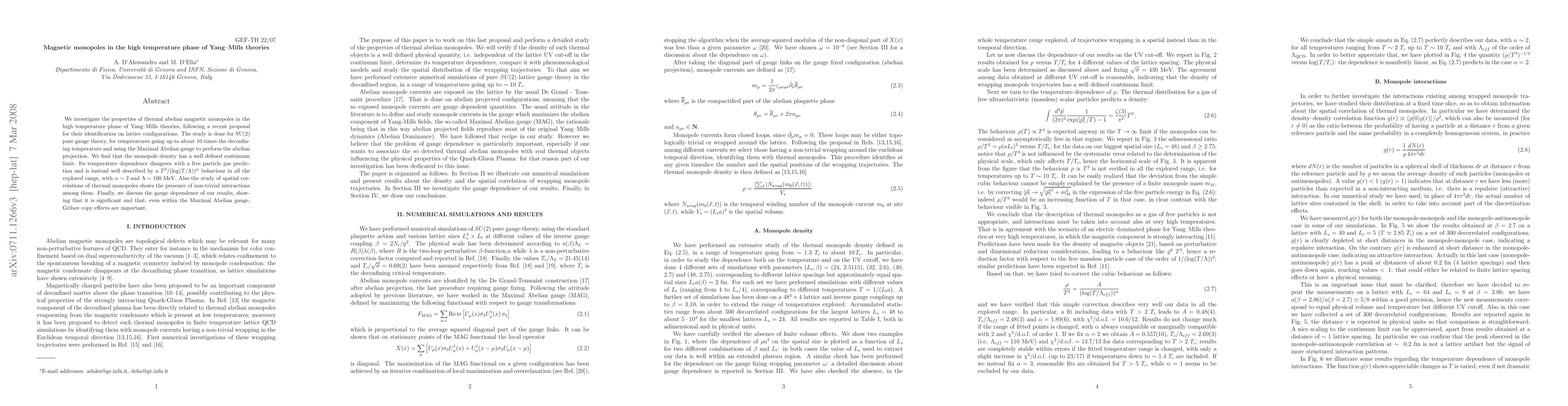 We investigate the properties of thermal abelian magnetic monopoles in the high temperature phase of Yang--Mills theories, following a recent proposal for their identification on lattice configurations. The study is done for SU(2) pure gauge theory, for temperatures going up to about 10 times the deconfining temperature and using the Maximal Abelian gauge to perform the abelian projection. We find that the monopole density has a well defined continuum limit. Its temperature dependence disagrees with a free particle gas prediction and is instead well described by a $T^3/(\log (T/\Lambda))^\alpha$ behaviour in all the explored range, with $\alpha \sim 2$ and $\Lambda \sim 100$ MeV. Also the study of spatial correlations of thermal monopoles shows the presence of non-trivial interactions among them. Finally, we discuss the gauge dependence of our results, showing that it is significant and that, even within the Maximal Abelian gauge, Gribov copy effects are important.