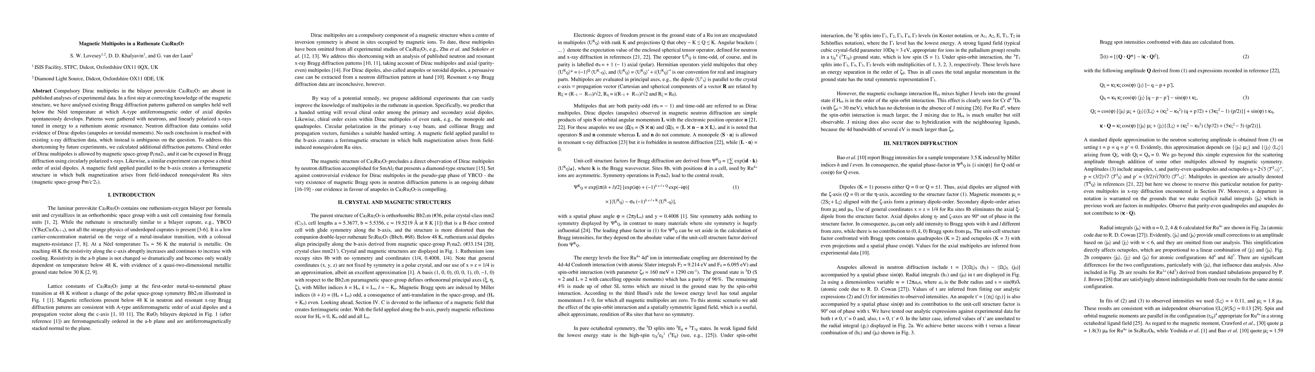 Compulsory Dirac multipoles in the bilayer perovskite Ca3Ru2O7 are absent in published analyses of experimental data. In a first step at correcting knowledge of the magnetic structure, we have analysed existing Bragg diffraction patterns gathered on samples held well below the N\'eel temperature at which A-type antiferromagnetic order of axial dipoles spontaneously develops. Patterns were gathered with neutrons, and linearly polarized x-rays tuned in energy to a ruthenium atomic resonance. Neutron diffraction data contains solid evidence of Dirac dipoles (anapoles or toroidal moments). No such conclusion is reached with existing x-ray diffraction data, which instead is ambiguous on the question. To address this shortcoming by future experiments, we calculated additional diffraction patterns. Chiral order of Dirac multipoles is allowed by magnetic space-group PCna21, and it can be exposed in Bragg diffraction using circularly polarized x-rays. Likewise, a similar experiment can expose a chiral order of axial dipoles. A magnetic field applied parallel to the b-axis creates a ferrimagnetic structure in which bulk magnetization arises from field-induced nonequivalent Ru sites (magnetic space-group Pm'c'21).