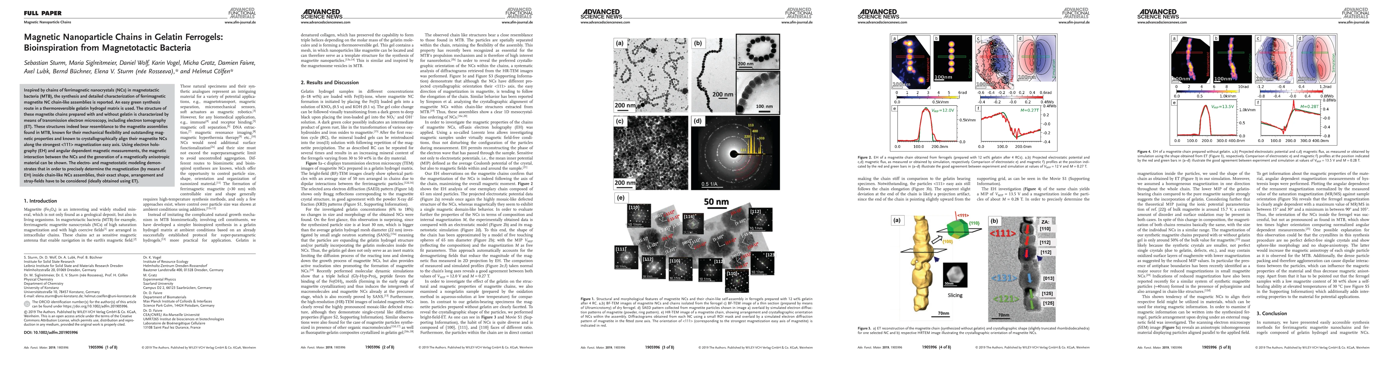 This paper reports the synthesis of ferrimagnetic magnetite nanoparticle chains in gelatin ferrogels inspired by magnetotactic bacteria, using a green synthesis method. Detailed characterization via electron microscopy reveals structural similarities to bacterial magnetite assemblies, and magnetic modeling shows the anisotropic magnetic properties of these chains.