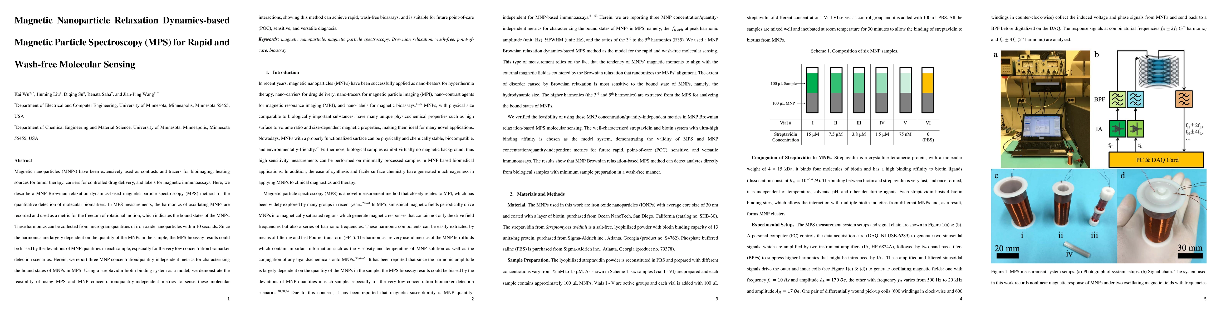 This paper introduces a magnetic particle spectroscopy (MPS) method based on the relaxation dynamics of magnetic nanoparticles (MNPs) for rapid, wash-free molecular sensing. The method measures the harmonics of oscillating MNPs to detect molecular biomarkers, demonstrating its potential for point-of-care diagnostics.