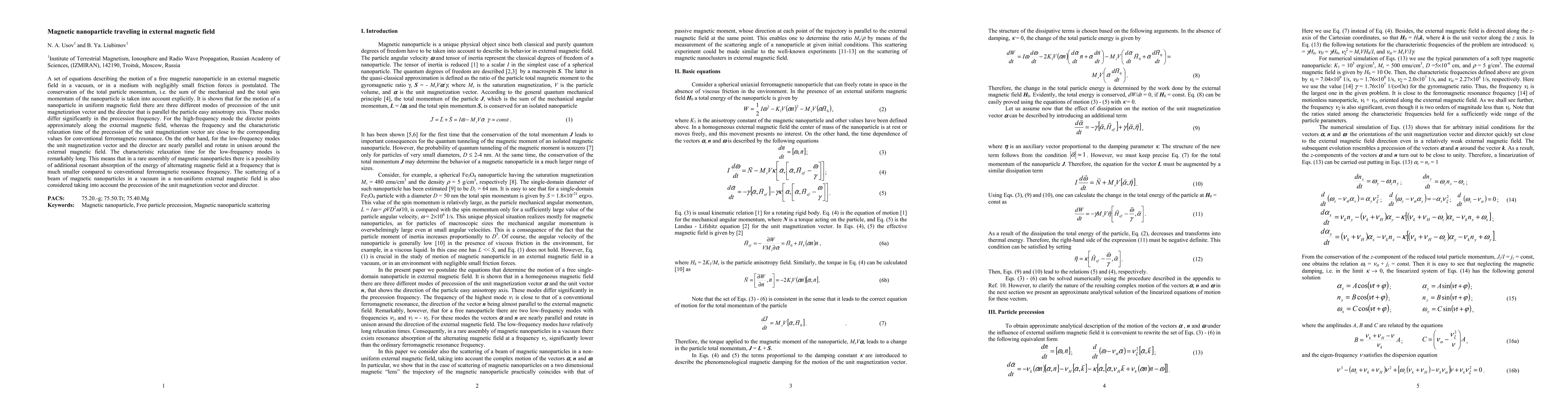 A set of equations describing the motion of a free magnetic nanoparticle in an external magnetic field in a vacuum, or in a medium with negligibly small friction forces is postulated. The conservation of the total particle momentum, i.e. the sum of the mechanical and the total spin momentum of the nanoparticle is taken into account explicitly. It is shown that for the motion of a nanoparticle in uniform magnetic field there are three different modes of precession of the unit magnetization vector and the director that is parallel the particle easy anisotropy axis. These modes differ significantly in the precession frequency. For the high-frequency mode the director points approximately along the external magnetic field, whereas the frequency and the characteristic relaxation time of the precession of the unit magnetization vector are close to the corresponding values for conventional ferromagnetic resonance. On the other hand, for the low-frequency modes the unit magnetization vector and the director are nearly parallel and rotate in unison around the external magnetic field. The characteristic relaxation time for the low-frequency modes is remarkably long. This means that in a rare assembly of magnetic nanoparticles there is a possibility of additional resonant absorption of the energy of alternating magnetic field at a frequency that is much smaller compared to conventional ferromagnetic resonance frequency. The scattering of a beam of magnetic nanoparticles in a vacuum in a non-uniform external magnetic field is also considered taking into account the precession of the unit magnetization vector and director.
