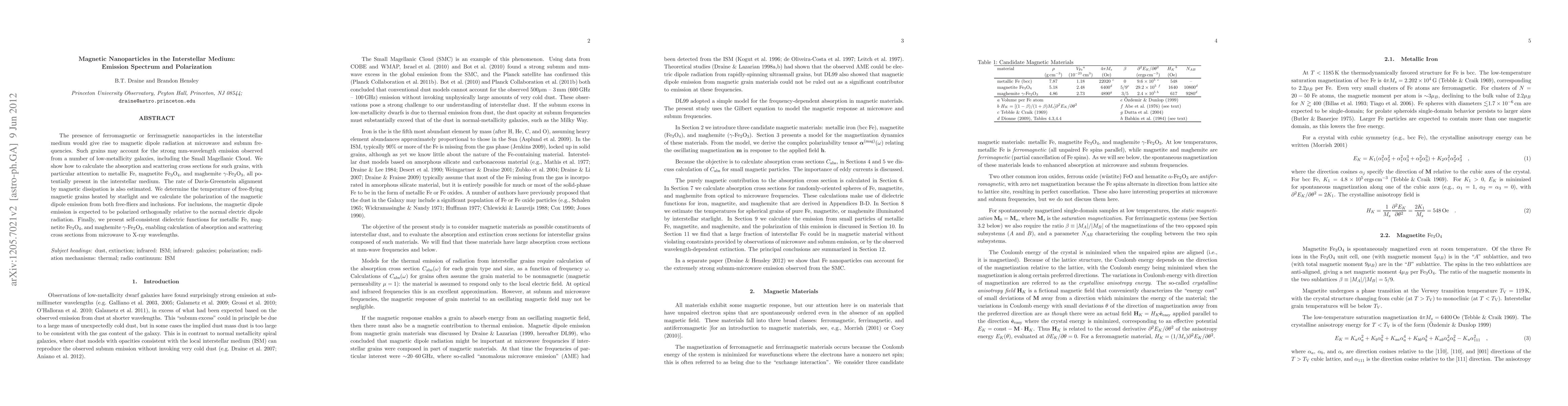 The presence of ferromagnetic or ferrimagnetic nanoparticles in the interstellar medium would give rise to magnetic dipole radiation at microwave and submm frequencies. Such grains may account for the strong mm-wavelength emission observed from a number of low-metallicity galaxies, including the Small Magellanic Cloud. We show how to calculate the absorption and scattering cross sections for such grains, with particular attention to metallic Fe, magnetite Fe3O4, and maghemite gamma-Fe2O3, all potentially present in the interstellar medium. The rate of Davis-Greenstein alignment by magnetic dissipation is also estimated. We determine the temperature of free-flying magnetic grains heated by starlight and we calculate the polarization of the magnetic dipole emission from both free-fliers and inclusions. For inclusions, the magnetic dipole emission is expected to be polarized orthogonally relative to the normal electric dipole radiation. Finally, we present self-consistent dielectric functions for metallic Fe, magnetite Fe3O4, and maghemite gamma-Fe2O3, enabling calculation of absorption and scattering cross sections from microwave to X-ray wavelengths.