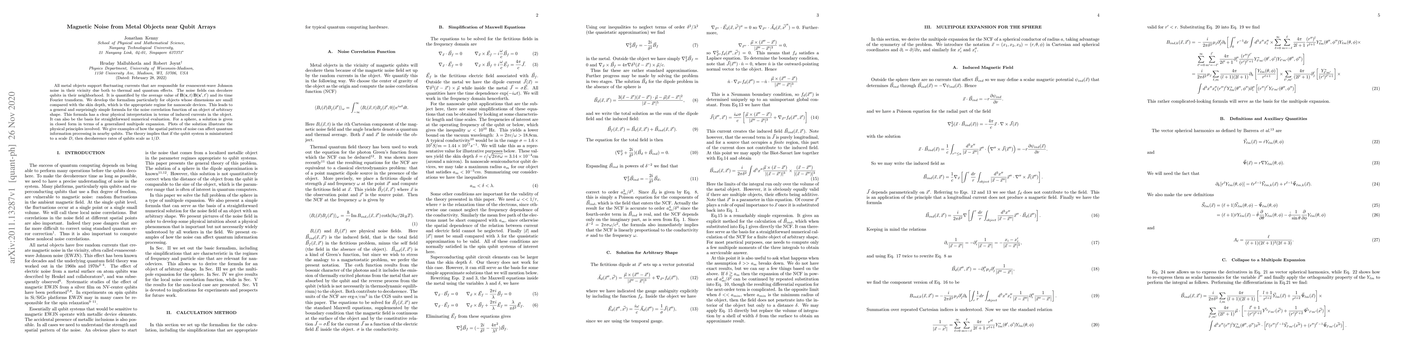 This paper develops a formalism to quantify magnetic noise from metal objects near qubit arrays, showing that fluctuating currents in metal objects generate decohering noise fields. The authors derive a simple formula for the noise correlation function, applicable to objects with dimensions smaller than the skin depth, and provide a closed-form solution for a spherical object, illustrating how spatial noise patterns impact qubit decoherence rates, which scale inversely with the system's miniaturization scale.