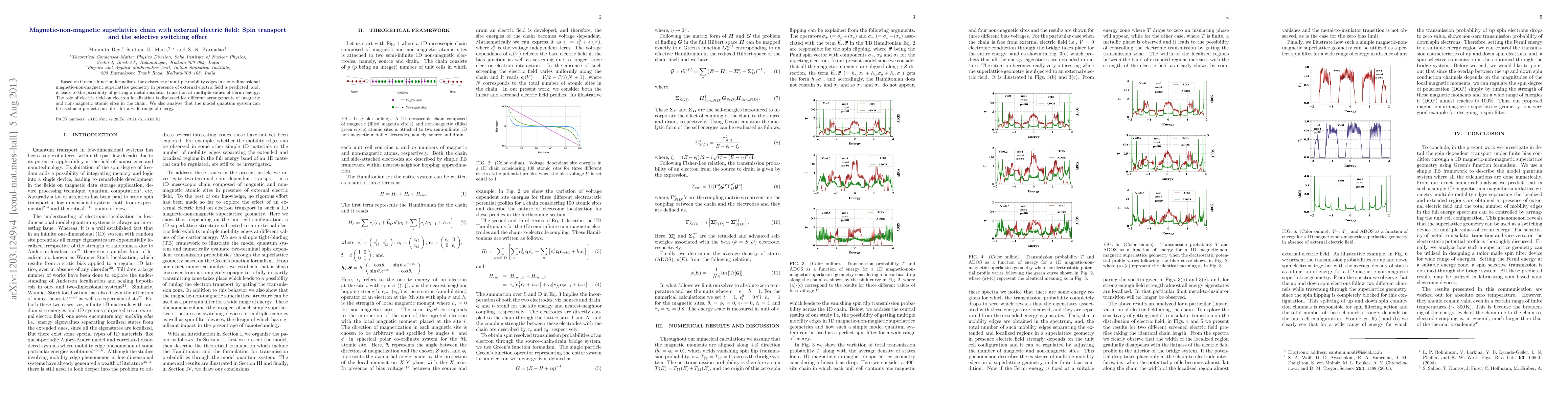This paper predicts multiple mobility edges and metal-insulator transitions in a one-dimensional magnetic-non-magnetic superlattice under an external electric field, using Green's function formalism. It also explores the electric field's role in electron localization and demonstrates the system's potential as an effective spin filter.