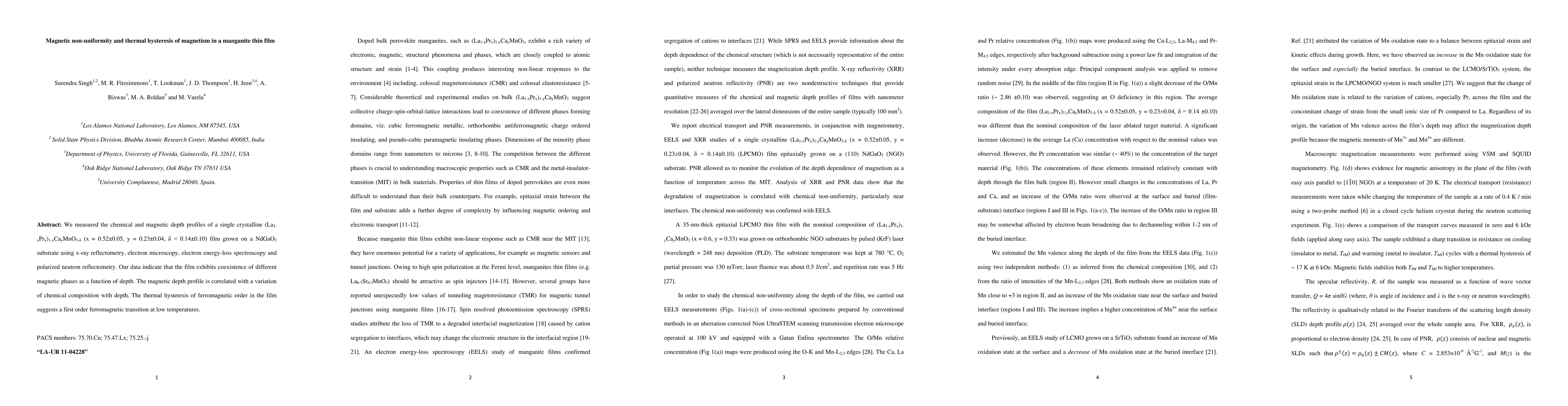 We measured the chemical and magnetic depth profiles of a single crystalline (La$_{1-x}$Pr$_x$)$_{1-y}$Ca$_y$MnO$_{3-{\delta}}$ (x = 0.52\pm0.05, y = 0.23\pm0.04, {\delta} = 0.14\pm0.10) film grown on a NdGaO3 substrate using x-ray reflectometry, electron microscopy, electron energy-loss spectroscopy and polarized neutron reflectometry. Our data indicate that the film exhibits coexistence of different magnetic phases as a function of depth. The magnetic depth profile is correlated with a variation of chemical composition with depth. The thermal hysteresis of ferromagnetic order in the film suggests a first order ferromagnetic transition at low temperatures.