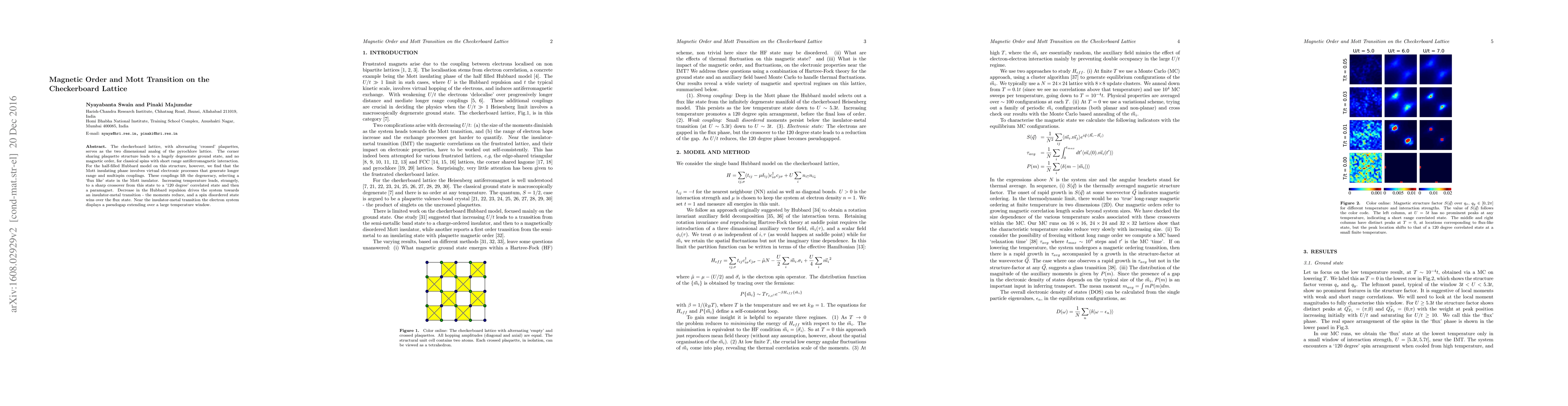 This paper investigates the magnetic order and Mott transition in the checkerboard lattice, revealing that the half-filled Hubbard model exhibits a 'flux like' Mott insulating phase with long-range couplings, transitioning to a '120 degree' correlated state upon heating and finally to a paramagnet. The study also highlights an insulator-metal transition with a pseudogap near the transition point.