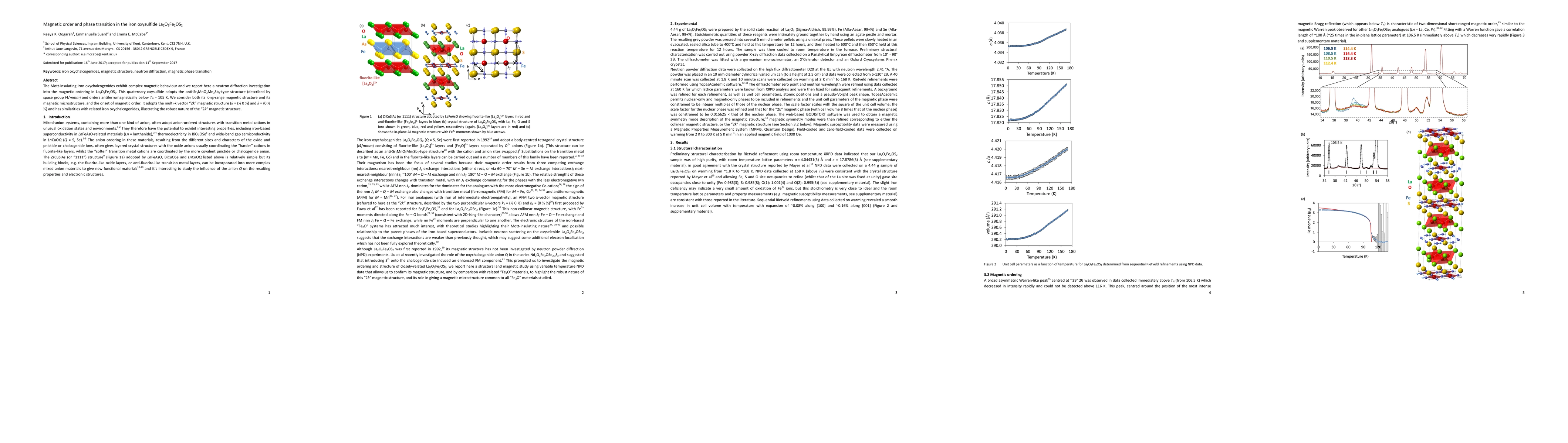 This paper investigates the magnetic ordering in the iron oxysulfide La2O2Fe2OS2, revealing antiferromagnetic ordering below TN = 105 K with a multi-k vector "2k" magnetic structure. The study highlights the robust nature of this "2k" magnetic structure in related compounds.