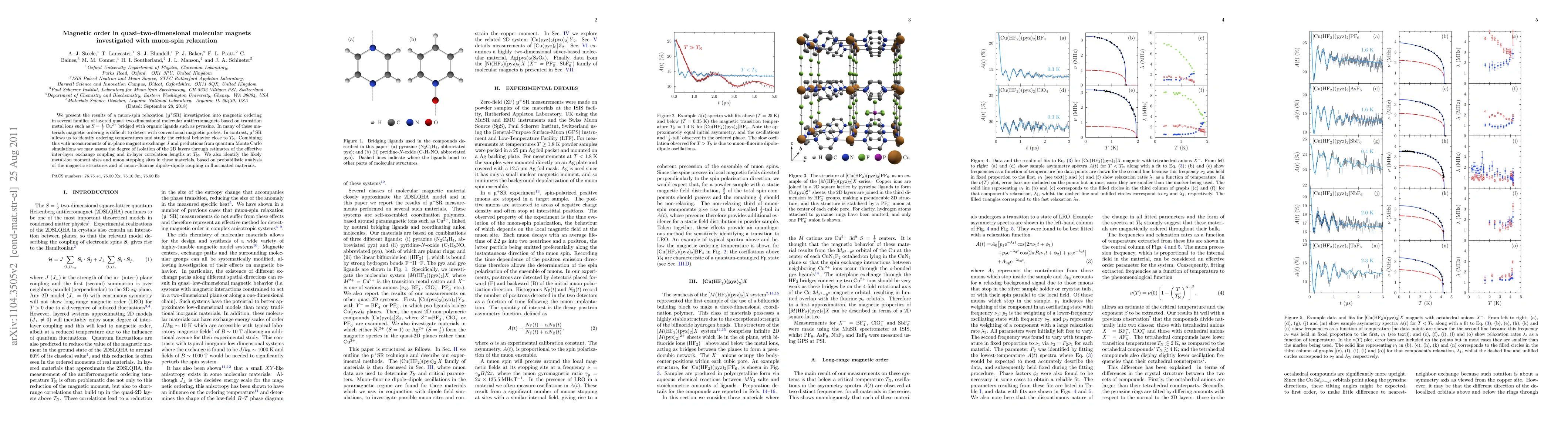We present the results of a muon-spin relaxation (muSR) investigation into magnetic ordering in several families of layered quasi-two-dimensional molecular antiferromagnets based on transition metal ions such as S=1/2 Cu2+ bridged with organic ligands such as pyrazine. In many of these materials magnetic ordering is difficult to detect with conventional magnetic probes. In contrast, muSR allows us to identify ordering temperatures and study the critical behavior close to T_N . Combining this with measurements of in-plane magnetic exchange J and predictions from quantum Monte Carlo simulations we may assess the degree of isolation of the 2D layers through estimates of the effective inter-layer exchange coupling and in-layer correlation lengths at T_N . We also identify the likely metal-ion moment sizes and muon stopping sites in these materials, based on probabilistic analysis of the magnetic structures and of muon-fluorine dipole-dipole coupling in fluorinated materials.