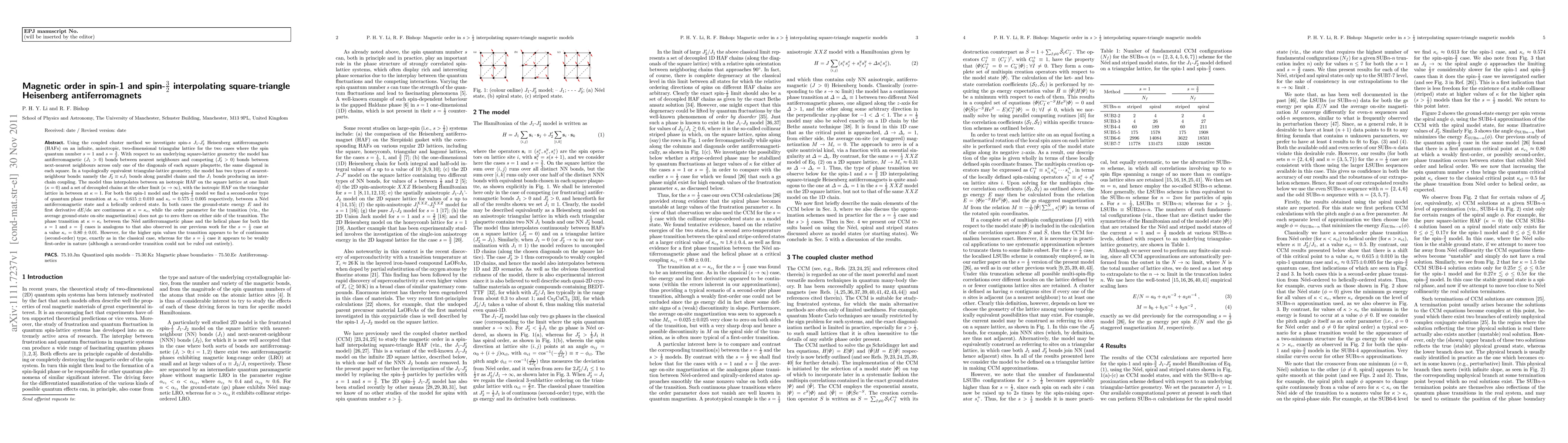 Researchers investigated magnetic order in spin-1 and spin-3/2 interpolating square-triangle Heisenberg antiferromagnets using coupled cluster method, finding a second-order quantum phase transition between Néel and helical states at specific anisotropy values.