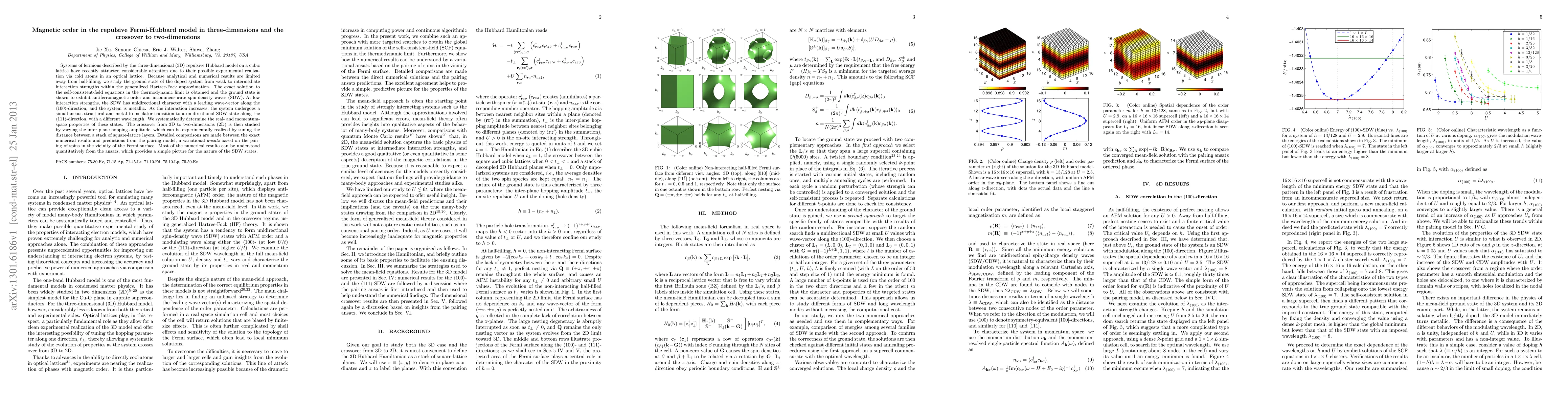 This research uses the generalized Hartree-Fock approximation to study the ground state of doped, three-dimensional repulsive Fermi-Hubbard models, revealing antiferromagnetic order and incommensurate spin-density waves. As interaction strength increases, a structural and metal-to-insulator transition occurs to a unidirectional SDW state along a different direction. The study also examines the crossover from 3D to two-dimensions, comparing numerical results with a spin-pairing model, providing insights into the nature of SDW states.