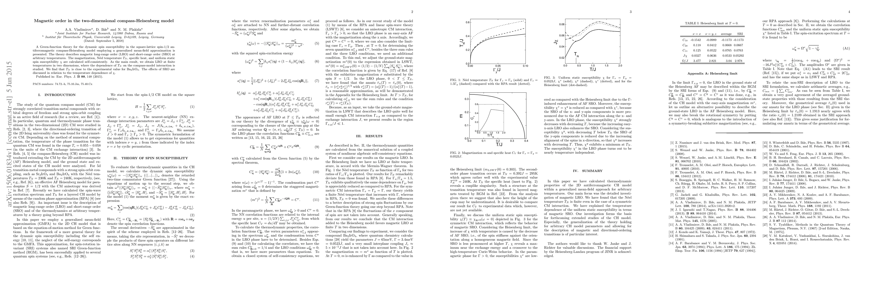 This paper presents a Green-function theory for the dynamic spin susceptibility in the two-dimensional compass-Heisenberg model, revealing magnetic long-range order at finite temperatures and calculating N'eel temperature, specific heat, and spin susceptibility. The study finds that the N'eel temperature closely matches experimental values for Ba2IrO4.
