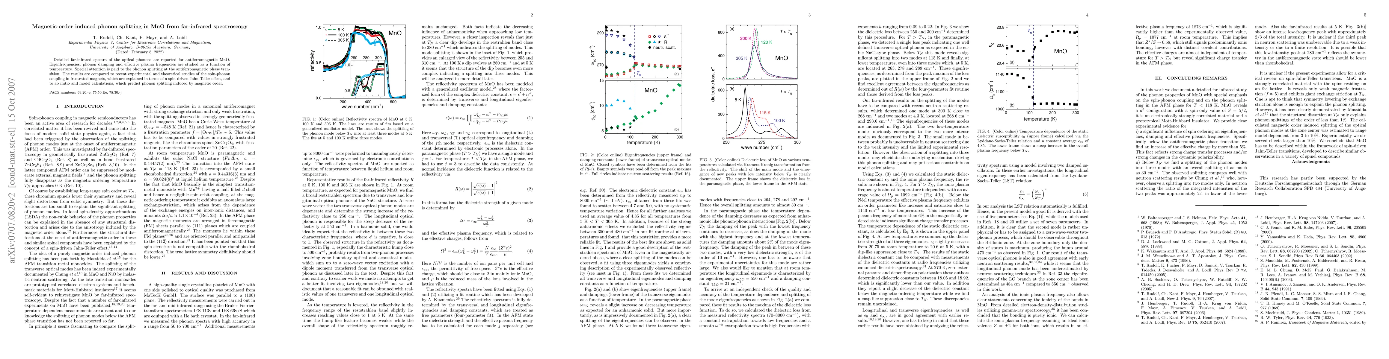 Detailed far-infrared spectra of the optical phonons are reported for antiferromagnetic MnO. Eigenfrequencies, phonon damping and effective plasma frequencies are studied as a function of temperature. Special attention is paid to the phonon splitting at the antiferromagnetic phase transition. The results are compared to recent experimental and theoretical studies of the spin-phonon coupling in frustrated magnets, which are explained in terms of a spin-driven Jahn-Teller effect, and to ab initio and model calculations, which predict phonon splitting induced by magnetic order.