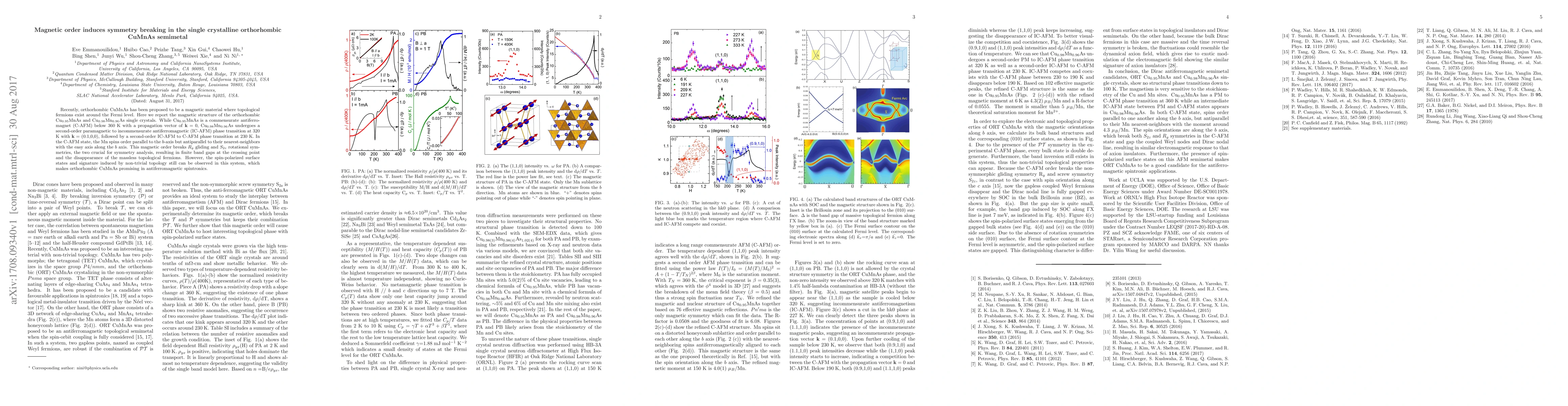 Recently, orthorhombic CuMnAs has been proposed to be a magnetic material where topological fermions exist around the Fermi level. Here we report the magnetic structure of the orthorhombic Cu0.95MnAs and Cu0.98Mn0.96As single crystals. While Cu0.95MnAs is a commensurate antiferromagnet (C-AFM) below 360 K with a propagation vector of k = 0, Cu0.98Mn0.96As undergoes a second-order paramagnetic to incommensurate antiferromagnetic (IC-AFM) phase transition at 320 K with k = (0.1,0,0), followed by a second-order IC-AFM to C-AFM phase transition at 230 K. In the C-AFM state, the Mn spins order parallel to the b-axis but antiparallel to their nearest-neighbors with the easy axis along the b axis. This magnetic order breaks Ry gliding and S2z rotational symmetries, the two crucial for symmetry analysis, resulting in finite band gaps at the crossing point and the disappearance of the massless topological fermions. However, the spin-polarized surface states and signature induced by non-trivial topology still can be observed in this system, which makes orthorhombic CuMnAs promising in antiferromagnetic spintronics.