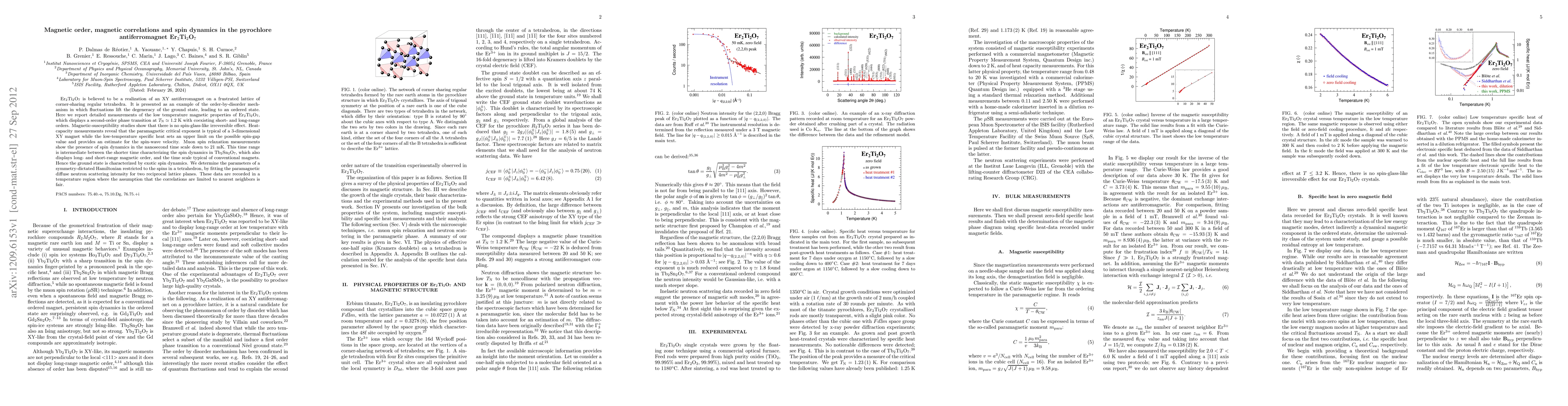Er2Ti2O7 is believed to be a realization of an XY antiferromagnet on a frustrated lattice of corner-sharing regular tetrahedra. It is presented as an example of the order-by-disorder mechanism in which fluctuations lift the degeneracy of the ground state, leading to an ordered state. Here we report detailed measurements of the low temperature magnetic properties of Er2Ti2O7, which displays a second-order phase transition at T_N \simeq 1.2 K with coexisting short- and long-range orders. Magnetic-susceptibility studies show that there is no spin-glass-like irreversible effect. Heat-capacity measurements reveal that the paramagnetic critical exponent is typical of a 3-dimensional XY magnet while the low-temperature specific heat sets an upper limit on the possible spin-gap value and provides an estimate for the spin-wave velocity. Muon spin relaxation measurements show the presence of spin dynamics in the nanosecond time scale down to 21 mK. This time range is intermediate between the shorter time characterizing the spin dynamics in Tb2Sn2O7, which also displays long- and short-range magnetic order, and the time scale typical of conventional magnets. Hence the ground state is characterized by exotic spin dynamics. We determine the parameters of a symmetry-dictated Hamiltonian restricted to the spins in a tetrahedron, by fitting the paramagnetic diffuse neutron scattering intensity for two reciprocal lattice planes. These data are recorded in a temperature region where the assumption that the correlations are limited to nearest neighbors is fair.