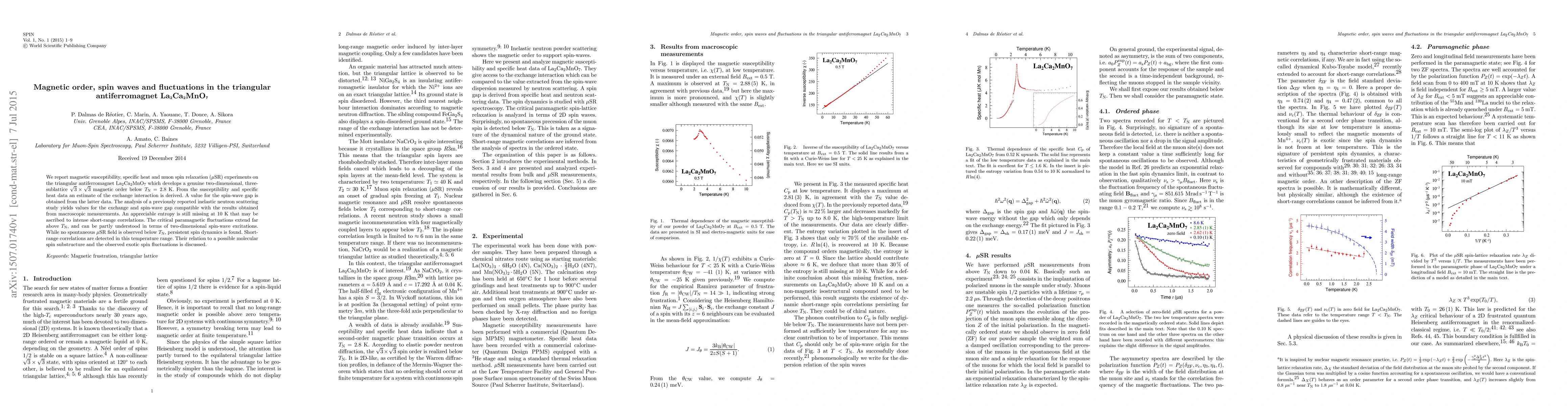 This paper investigates the magnetic order and spin dynamics in the triangular antiferromagnet La2Ca2MnO7, revealing a two-dimensional, three-sublattice magnetic order below 2.8 K. The study finds intense short-range correlations and significant entropy deficit, suggesting exotic spin fluctuations and persistent spin dynamics without spontaneous muon spin rotation below the Néel temperature.