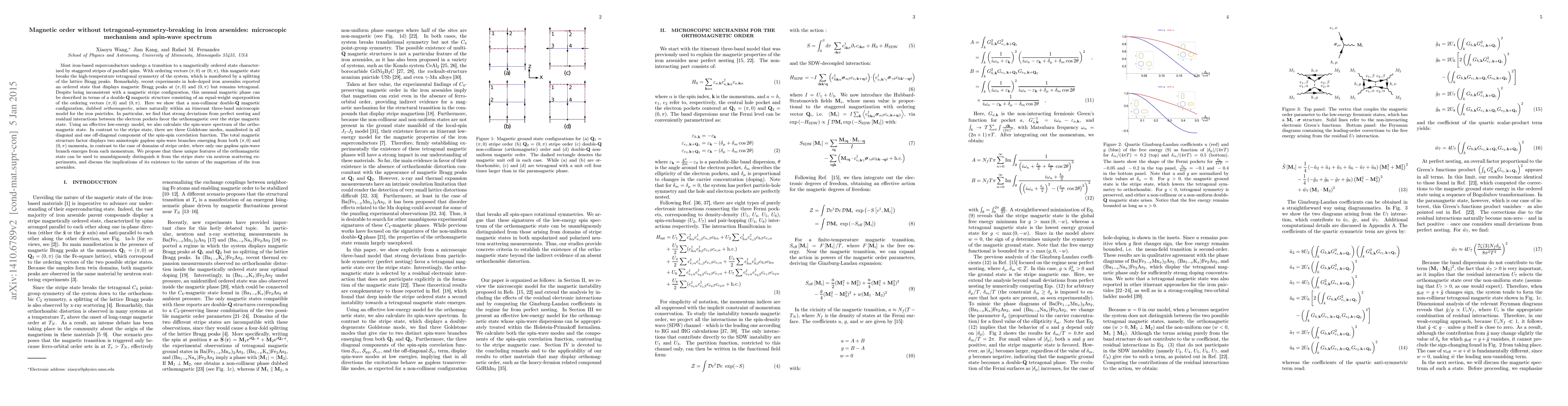 This paper investigates a magnetically ordered state in iron arsenides that maintains tetragonal symmetry despite the presence of magnetic Bragg peaks, termed the orthomagnetic state. The study reveals that this state arises naturally from a three-band microscopic model and features a unique spin-wave spectrum with three Goldstone modes, distinguishing it from the conventional magnetic stripe state.