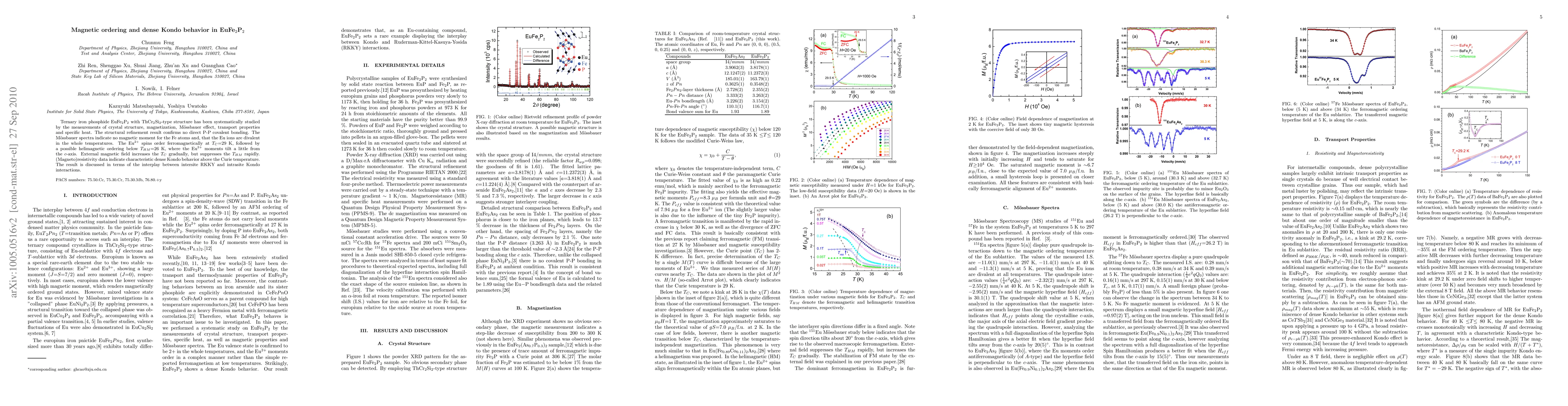 EuFe$_2$P$_2$ exhibits ferromagnetic ordering of Eu$^{2+}$ ions at 29.5 K, with possible helimagnetic behavior below 26 K, and dense Kondo behavior above the Curie temperature.
