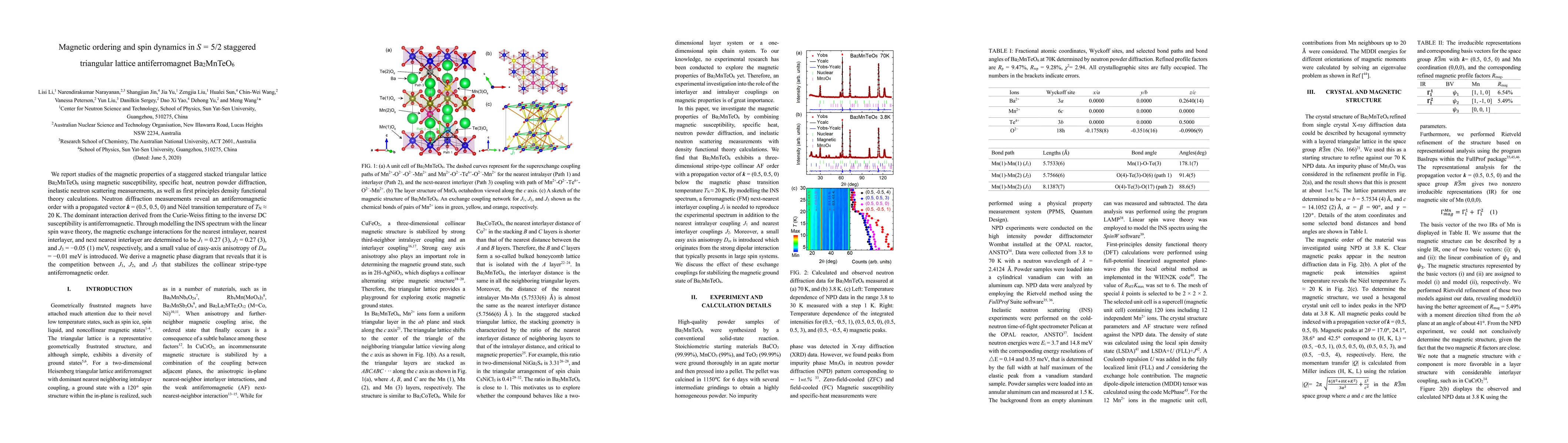 The research investigates the magnetic properties of Ba$_2$MnTeO$_6$, a staggered triangular lattice antiferromagnet. Utilizing multiple measurement techniques and theoretical calculations, the study confirms an antiferromagnetic order with a propagation vector (0.5, 0.5, 0) and a Néel temperature of approximately 20 K. The magnetic exchange interactions are determined as J1=0.27(3) meV, J2=0.27(3) meV, and J3=-0.05(1) meV for nearest intralayer, interlayer, and next nearest interlayer, respectively. A small easy-axis anisotropy of Dzz=-0.01 meV is also identified, with the magnetic phase diagram illustrating the balance between J1, J2, and J3 stabilizing the collinear stripe-type antiferromagnetic order.