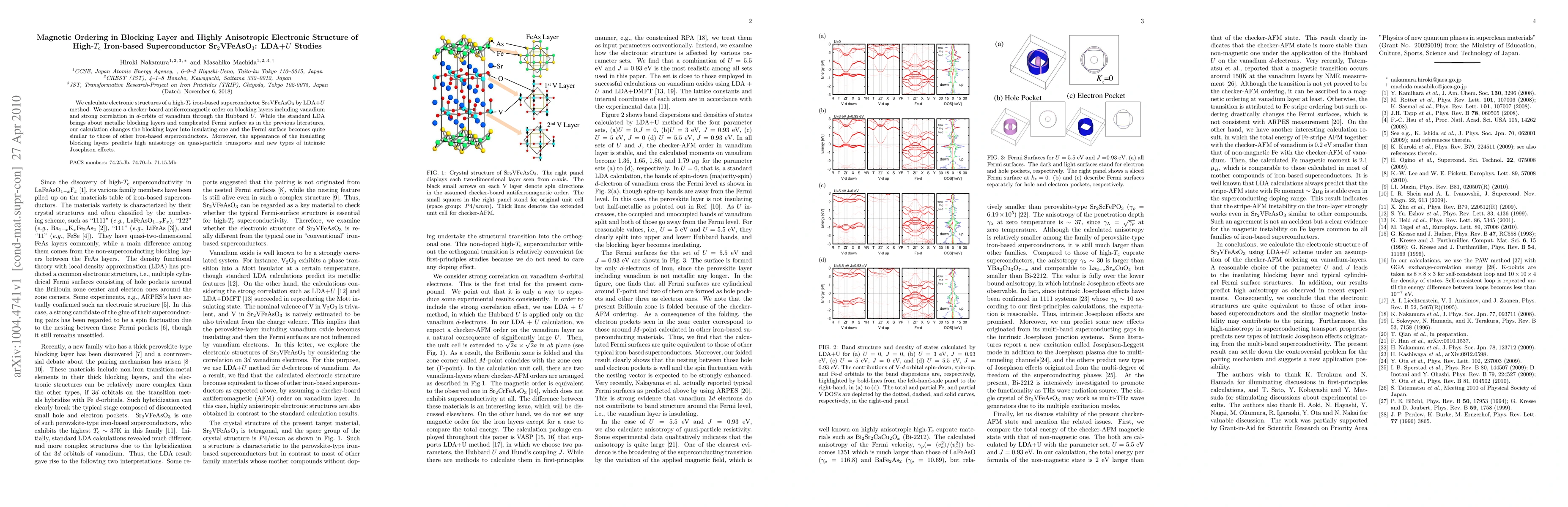 We calculate electronic structures of a high-Tc iron-based superconductor Sr2VFeAsO3 by LDA+U method. We assume a checker-board antiferromagnetic order on blocking layers including vanadium and strong correlation in d-orbits of vanadium through the Hubbard U. While the standard LDA brings about metallic blocking layers and complicated Fermi surface as in the previous literatures, our calculation changes the blocking layer into insulating one and the Fermi surface becomes quite similar to those of other iron-based superconductors. Moreover, the appearance of the insulating blocking layers predicts high anisotropy on quasi-particle transports and new types of intrinsic Josephson effects.