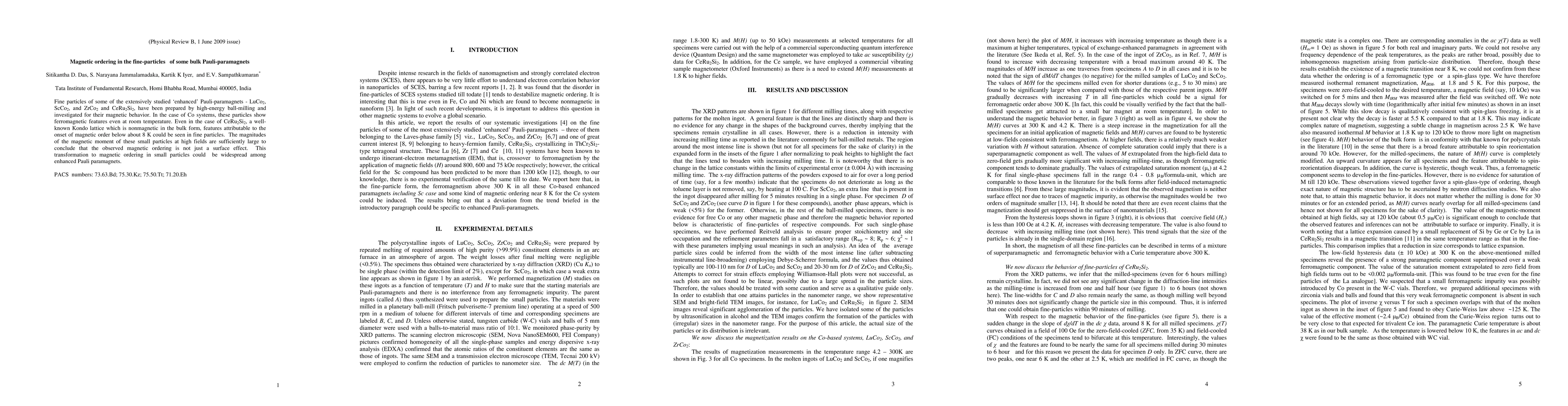This study investigates the magnetic behavior of fine particles of enhanced Pauli paramagnets prepared via high-energy ball-milling, revealing that Co-based systems exhibit ferromagnetic features at room temperature, while CeRu2Si2 particles show magnetic order onset below 8 K, indicating a transformation from non-magnetic bulk to magnetically ordered particles.
