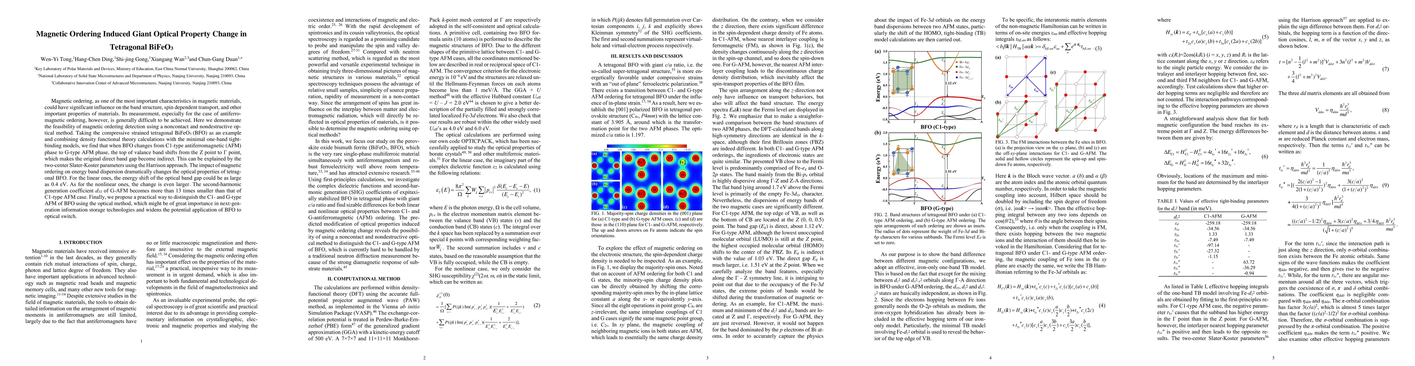 Magnetic ordering, as one of the most important characteristics in magnetic materials, could have significant influence on the band structure, spin dependent transport, and other important properties of materials. Its measurement, especially for the case of antiferromagnetic ordering, however, is generally difficult to be achieved. Here we demonstrate the feasibility of magnetic ordering detection using a noncontact and nondestructive optical method. Taking the compressive strained tetragonal BiFeO3 (BFO) as an example and combining density functional theory calculations with the minimal one-band tight-binding models, we find that when BFO changes from C1-type antiferromagnetic (AFM) phase to G-type AFM phase, the top of valance band shifts from the Z point to {\Gamma} point, which makes the original direct band gap become indirect. This can be explained by the two-center Slater-Koster parameters using the Harrison approach. The impact of magnetic ordering on energy band dispersion dramatically changes the optical properties of tetragonal BFO. For the linear ones, the energy shift of the optical band gap could be as large as 0.4 eV. As for the nonlinear ones, the change is even larger. The second-harmonic generation coefficient d33 of G-AFM becomes more than 13 times smaller than that of C1-type AFM case. Finally, we propose a practical way to distin-guish the C1- and G-type AFM of BFO using the optical method, which might be of great importance in next-generation information storage technologies and widens the potential application of BFO to optical switch.