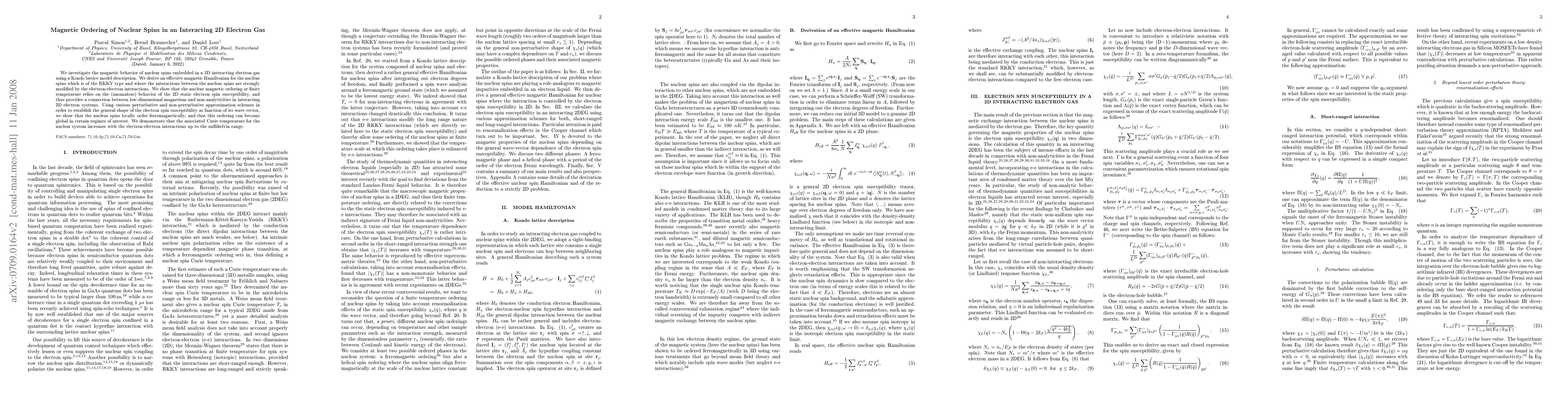 This paper explores the magnetic behavior of nuclear spins in a 2D interacting electron gas, deriving an effective RKKY-type Hamiltonian that accounts for electron-electron interactions. It finds that nuclear spins can order ferromagnetically at millikelvin temperatures, with the Curie temperature increasing with stronger electron-electron interactions, linking low-dimensional magnetism to non-analyticities in 2D electron systems.