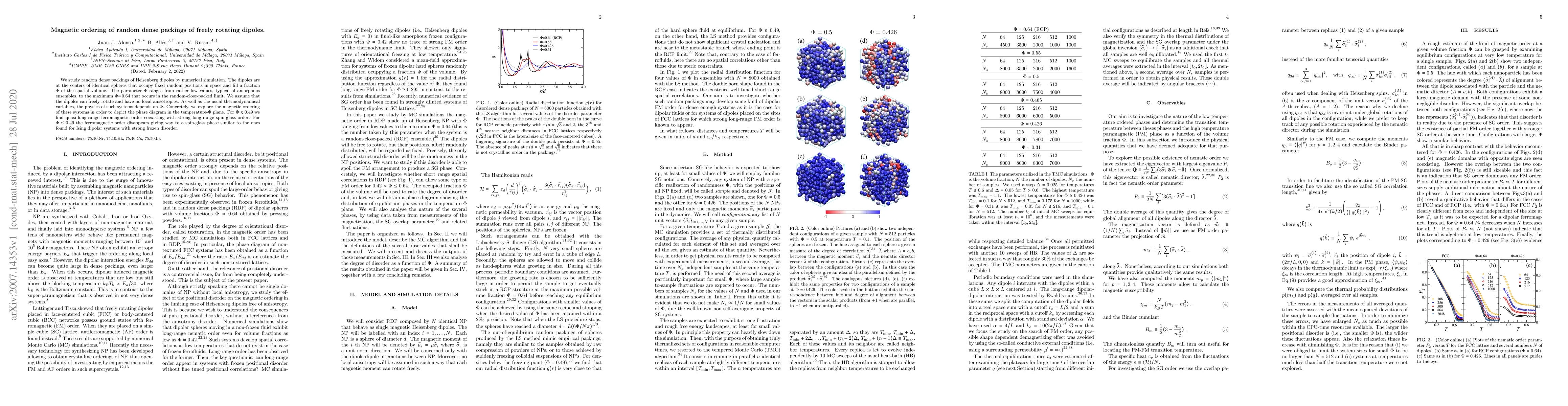 Researchers study random dense packings of freely rotating dipoles to understand magnetic ordering in a temperature-$ε$ plane, revealing two distinct phases: ferromagnetic order with strong spin-glass behavior for $ε gtrsim 0.49$, and a spin-glass phase below this threshold.