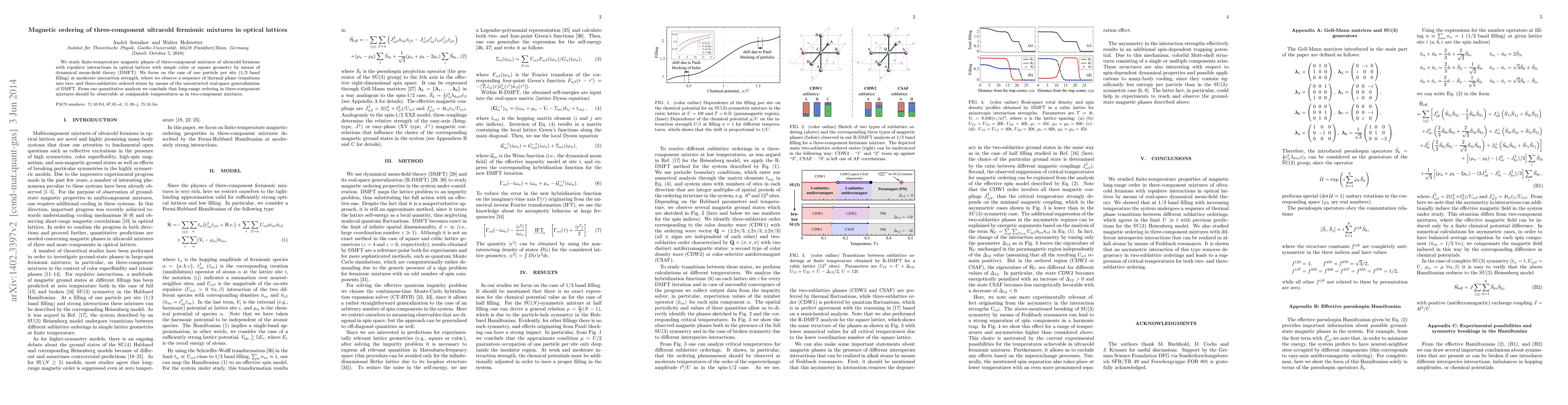 This paper investigates the magnetic ordering of three-component mixtures of ultracold fermions in optical lattices using dynamical mean-field theory. It finds that at moderate interaction strength and 1/3 band filling, the system undergoes thermal phase transitions into two- and three-sublattice ordered states, suggesting that long-range magnetic ordering in these mixtures is observable at comparable temperatures to that in two-component mixtures.